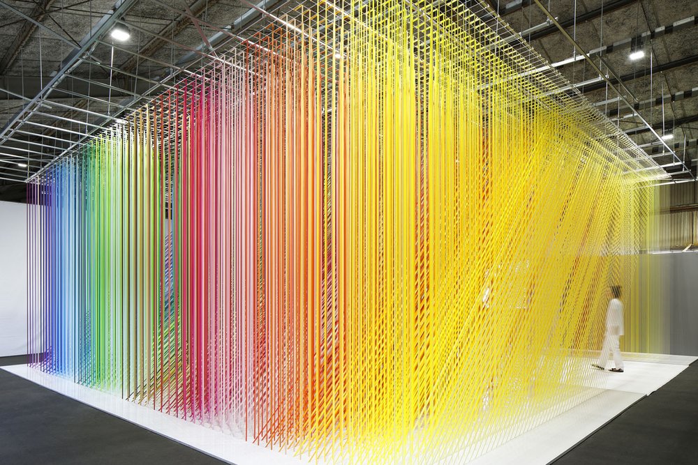 “Visitors can walk through a tunnel cut out of the installation, experiencing the 100 colors gradation and its overlapping effects. The colors and lines overlap and change depending on the viewing angle, creating a beautiful rainbow moire that creates various expressions,” says Moureaux.