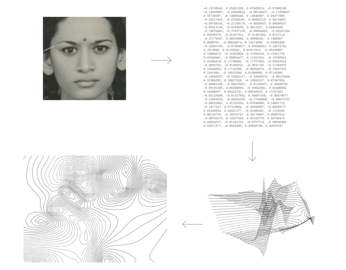 “In extracting biometrics from my family photos, in a futile way, I seek some kind of static truth in them,” said Akkapeddi. “I dilute them, stripping them of their emotional and cultural contexts, down to their mathematized value. And in aesthetically reinterpreting this data, I highlight biometric data collection as not only a reductive process but perhaps a productive process in its creation of new externalized, alternative representations of identity.”