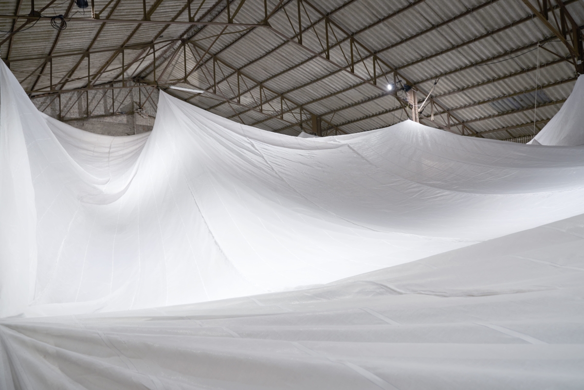 Created by interaction designer Jasna Dimitrovska, spatial designer Jaenam Lim and architect Kazumasa Takada as part of Designregio Kortrijk’s Designers in Residence program, FOS is a spatial system that utilizes scaffolding tarps to repurpose abandoned buildings.