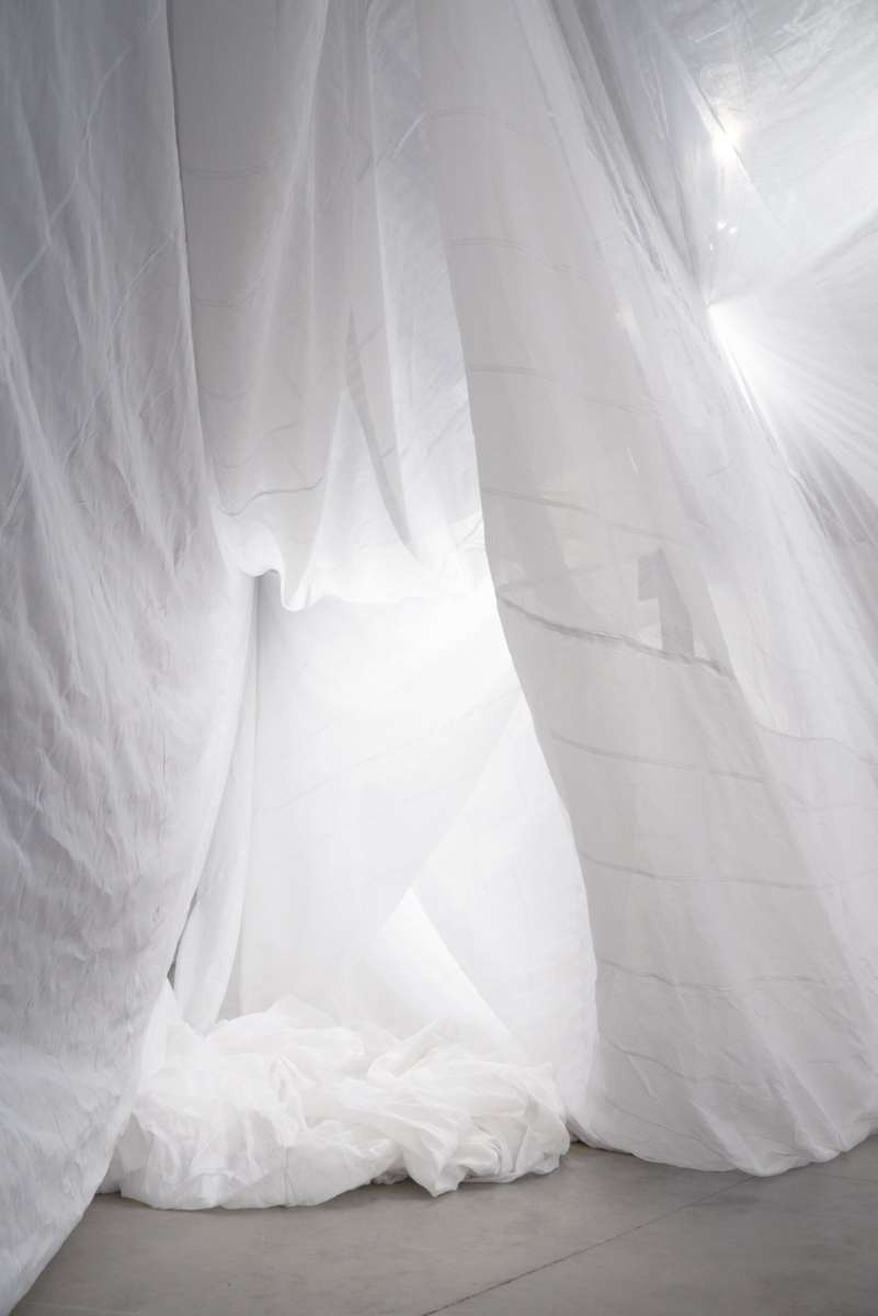 For a demonstration, the spatial system was presented in an empty flax storehouse in Belgium alongside a projection mapping installation has created by artist Omar Elkammar.