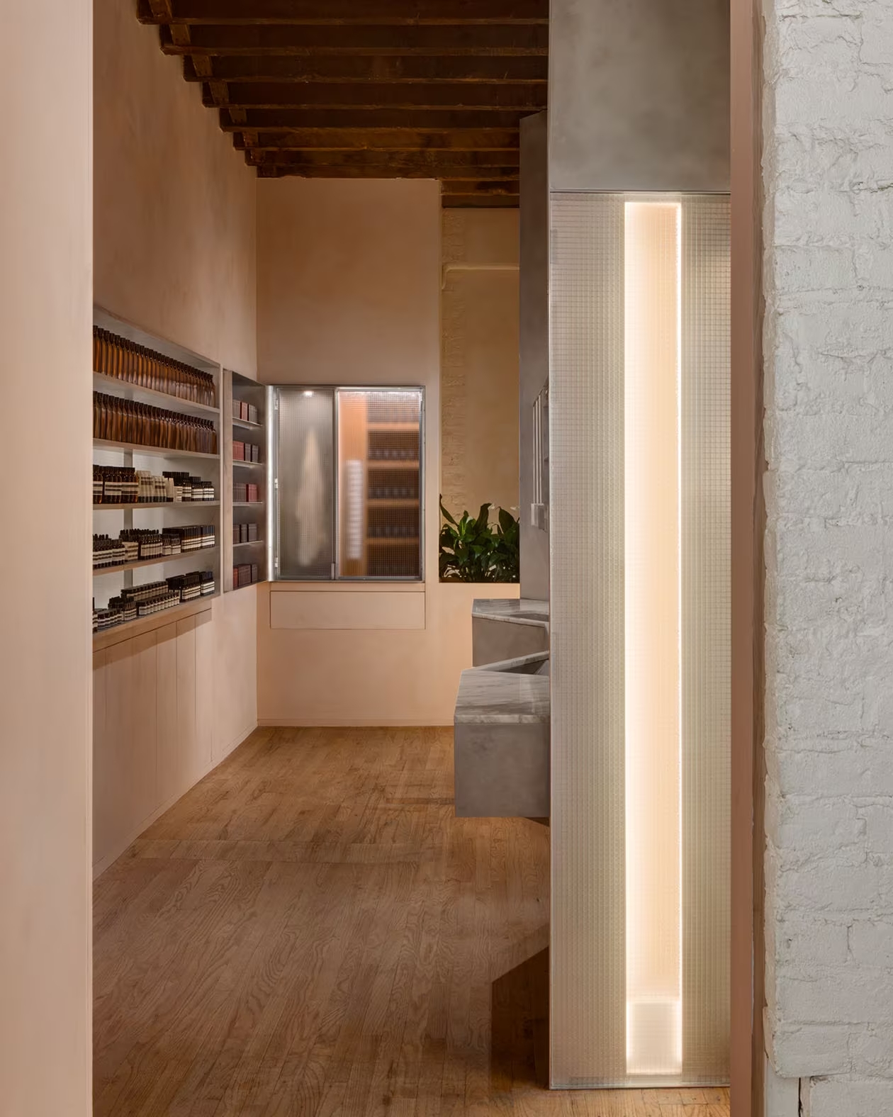 Fast forward thirteen years and Aesop’s in-house design team decided to give their Nolita store a makeover. Instead of discarding the original brick walls and ceiling, they chose to celebrate their imperfections, seeing them as testaments to the building’s storied past. The result is a store that feels both familiar and transformed, echoing the spirit of Nolita itself.