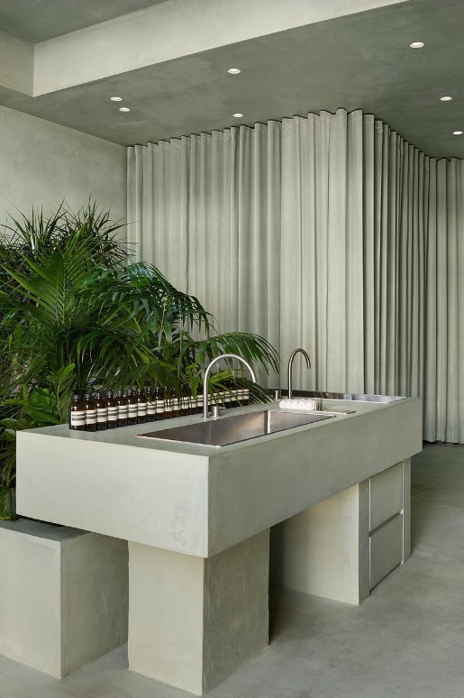 One of the most striking features of Aesop Palisades Village is the introduction of a skylight that bathes a new interior garden in natural light. This garden serves as the focal point of the store, a tranquil oasis within the bustling city. Wrapped around the garden is a bench, product display, and consultation sink, all nestled amidst lush foliage. This integration of nature into the store’s interior creates an inviting and serene atmosphere, further enhancing the connection between the built environment and the natural world.
