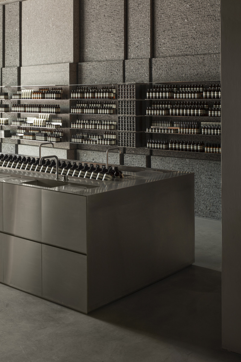 In addition to rows of metal sinks where customers can test Aesop’s products, there are three standalone sinks with mirrors for a more private setting.