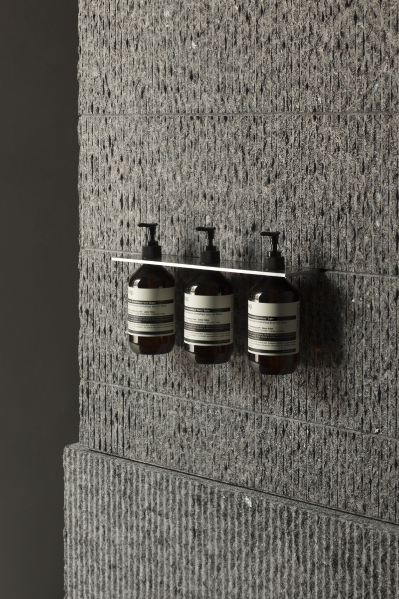 With stone walls that feature carved grooves, the products placed on the metal shelves are highlighted