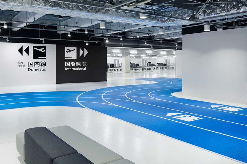 With functionality and economical design in mind, the Narita International Airport Terminal 3 in Japan has opted to use running tracks instead of the conventional moving walkways and illuminated signs.