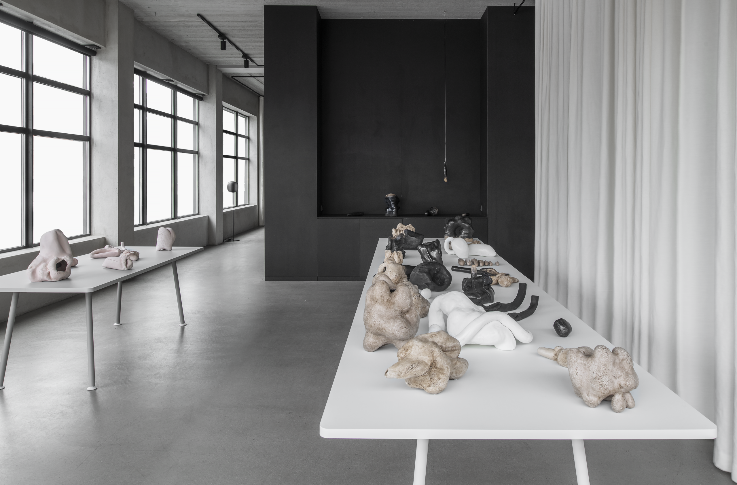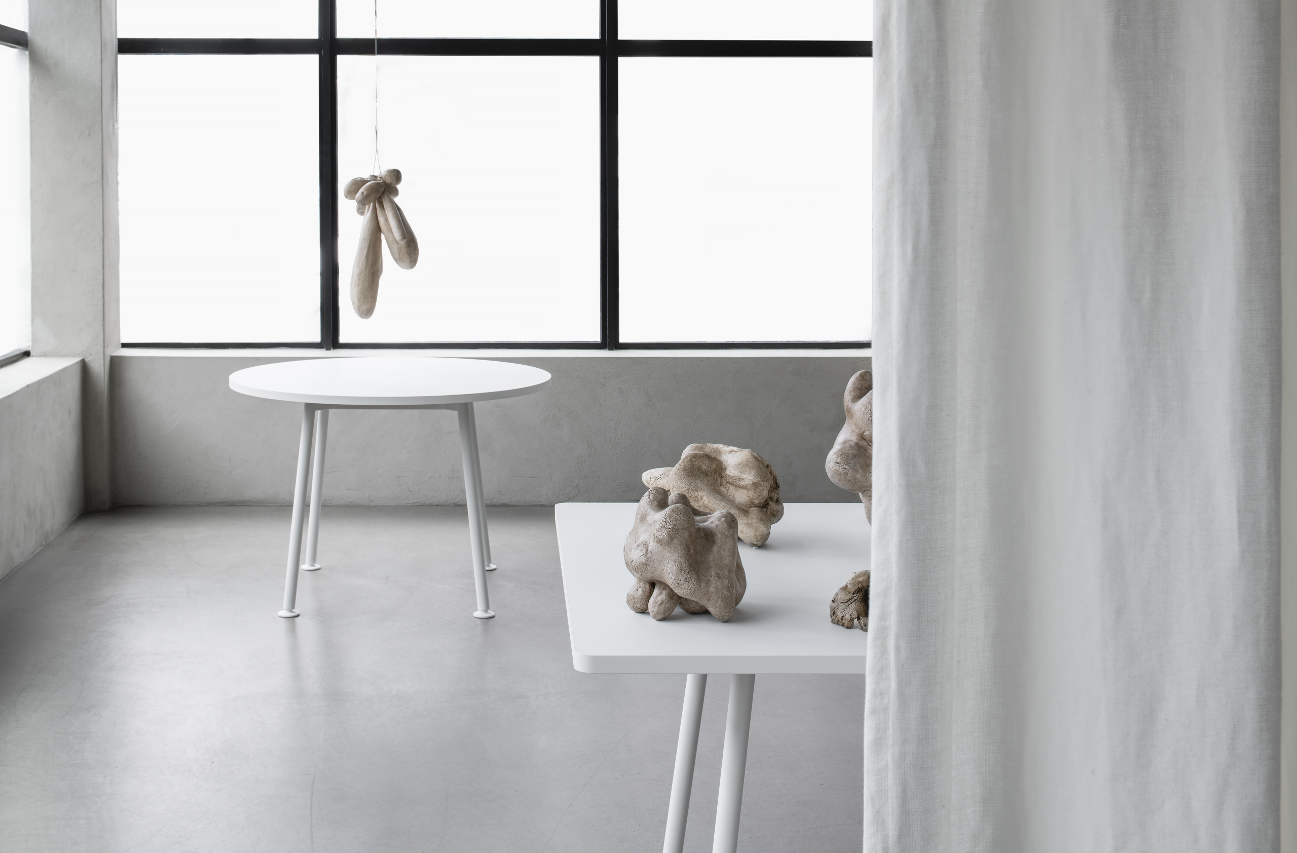 The installation comprises a series of stoneware sculptures in varying forms presented on top of the Landa tables. The sculptures are stained with gouache, shoe polish and linseed oil.