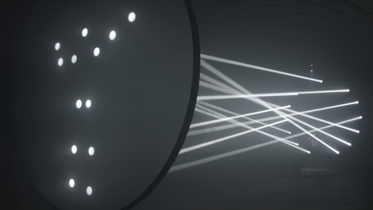 Utilizing camera sensors alongside motorized beams of white light, a “striking visual display” of a human body’s key points such as the head, shoulders, elbows, hands, knees and feet are projected onto a large circular screen in real-time.