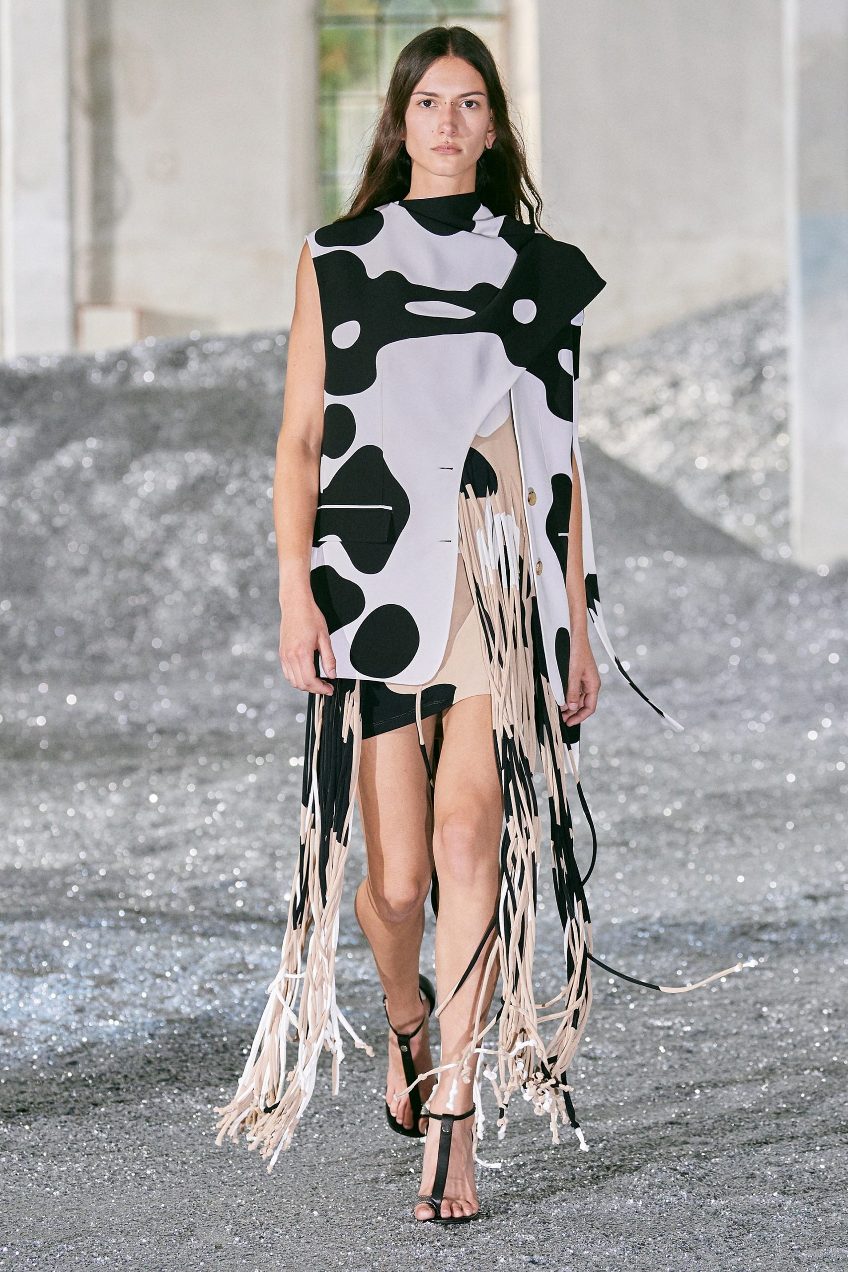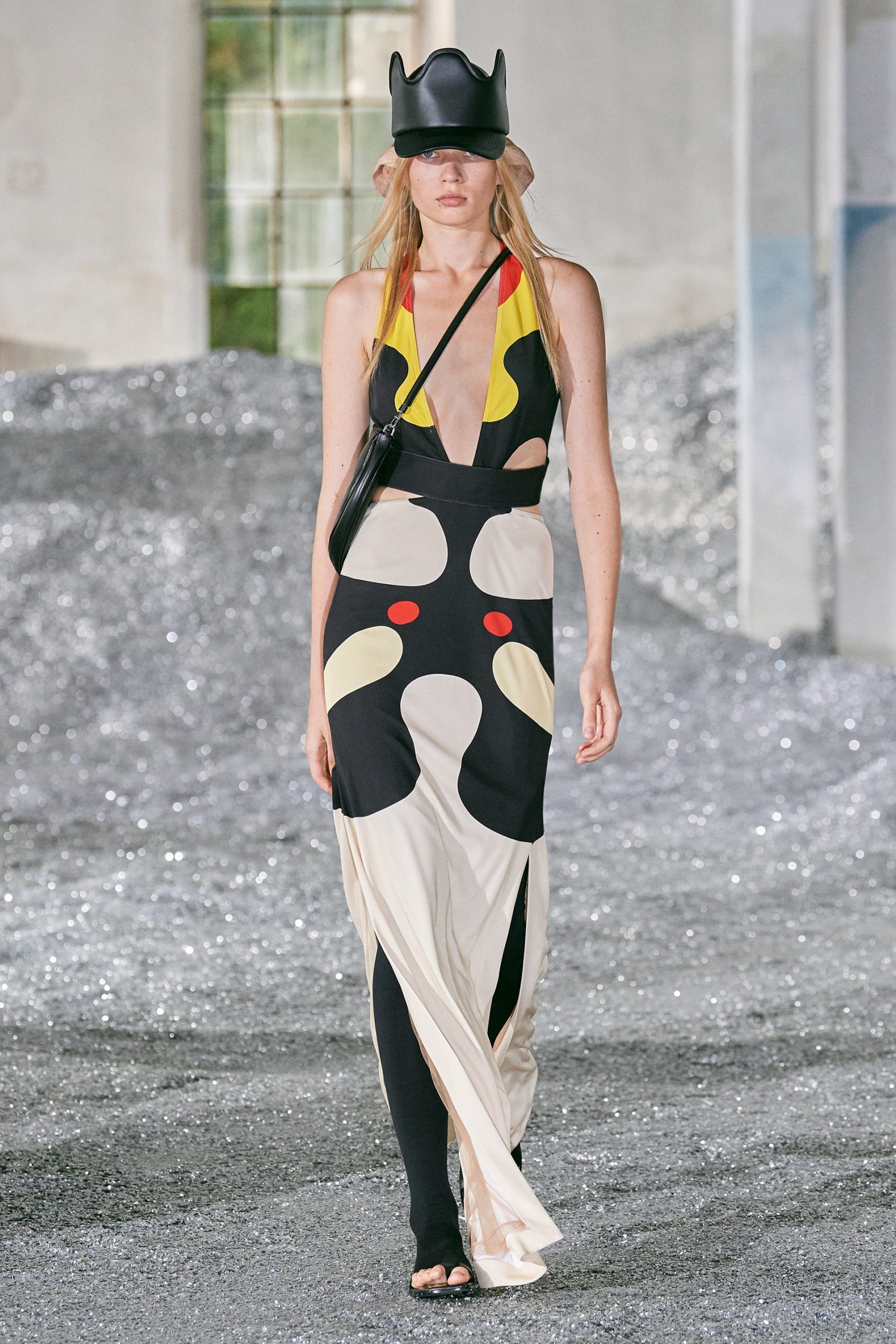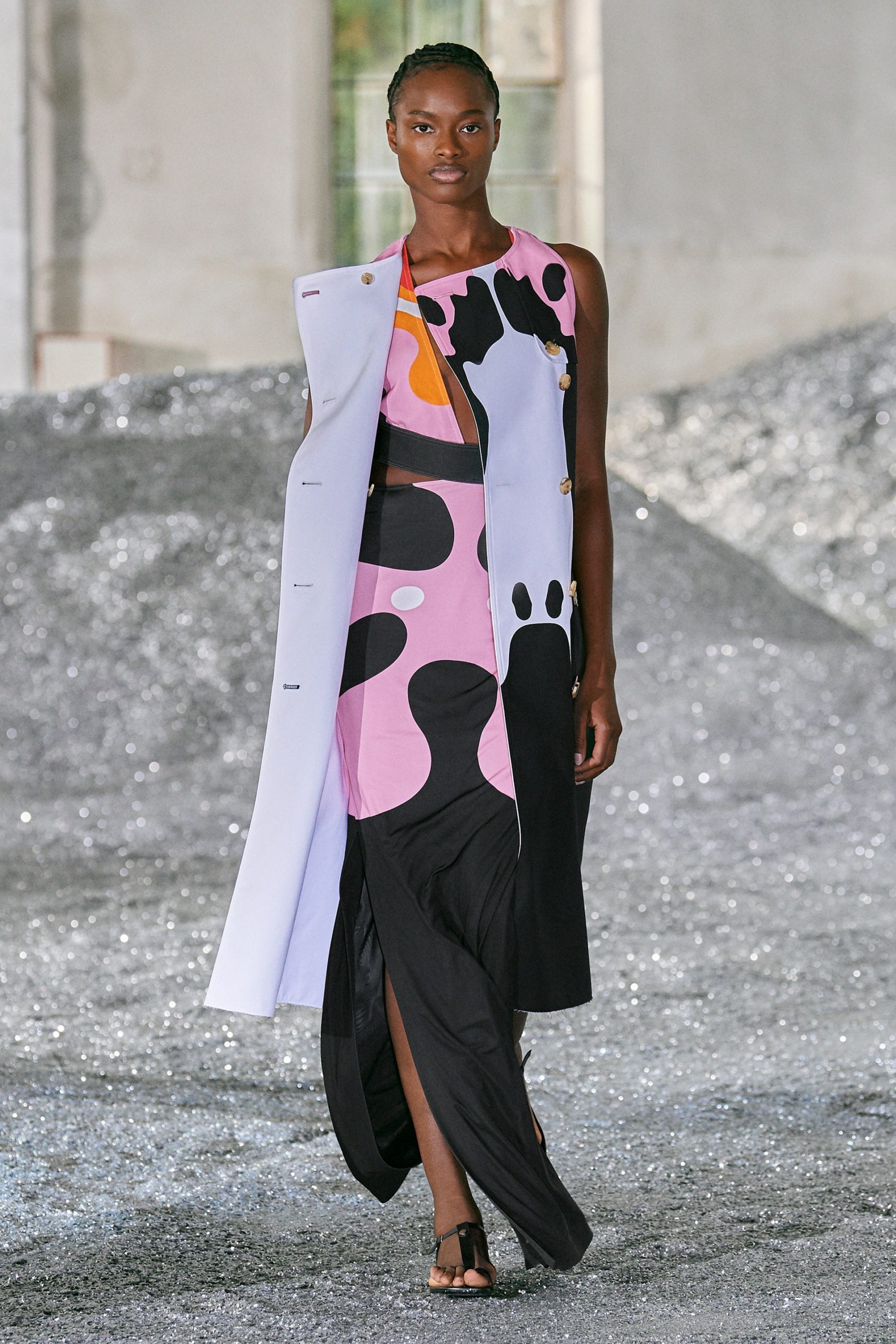 Beyond the sustainable components, Burberry’s Spring/Summer 2022 womenswear collection was rife with rebellious, youthful energy in the form of raw hems, abstract patterns, exaggerated details, bold silhouettes, and cropped pieces. Overall, experimental design was at the heart of the collection, evidenced in both the styles of the pieces, as well as the sustainable elements utilized.