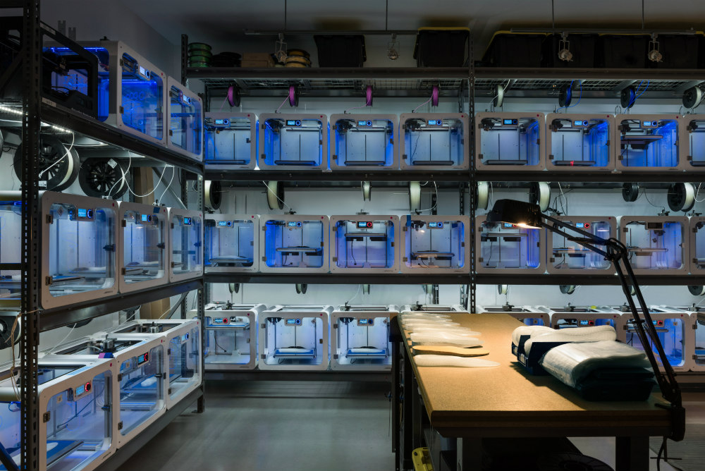 Behind a cloudy glass wall is an office and workshop where numerous 3D printers are stacked.