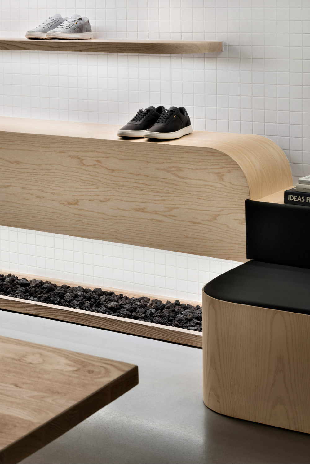 Upon entering the store, customers are met with a bright and minimalist space of white tile walls and polished concrete flooring filled with wood furniture and shelving alongside greenery.