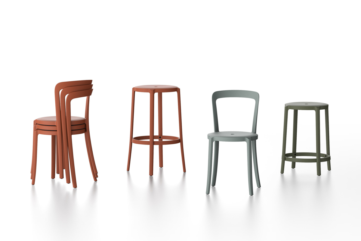 Launched at Milan Design Week 2019, the collection titled On & On is designed to be lightweight, durable, stackable and suitable for both indoor and outdoor use. The chairs and stools are comprised of recycled plastic bottles (rPET), non-toxic pigment and glass fibres.