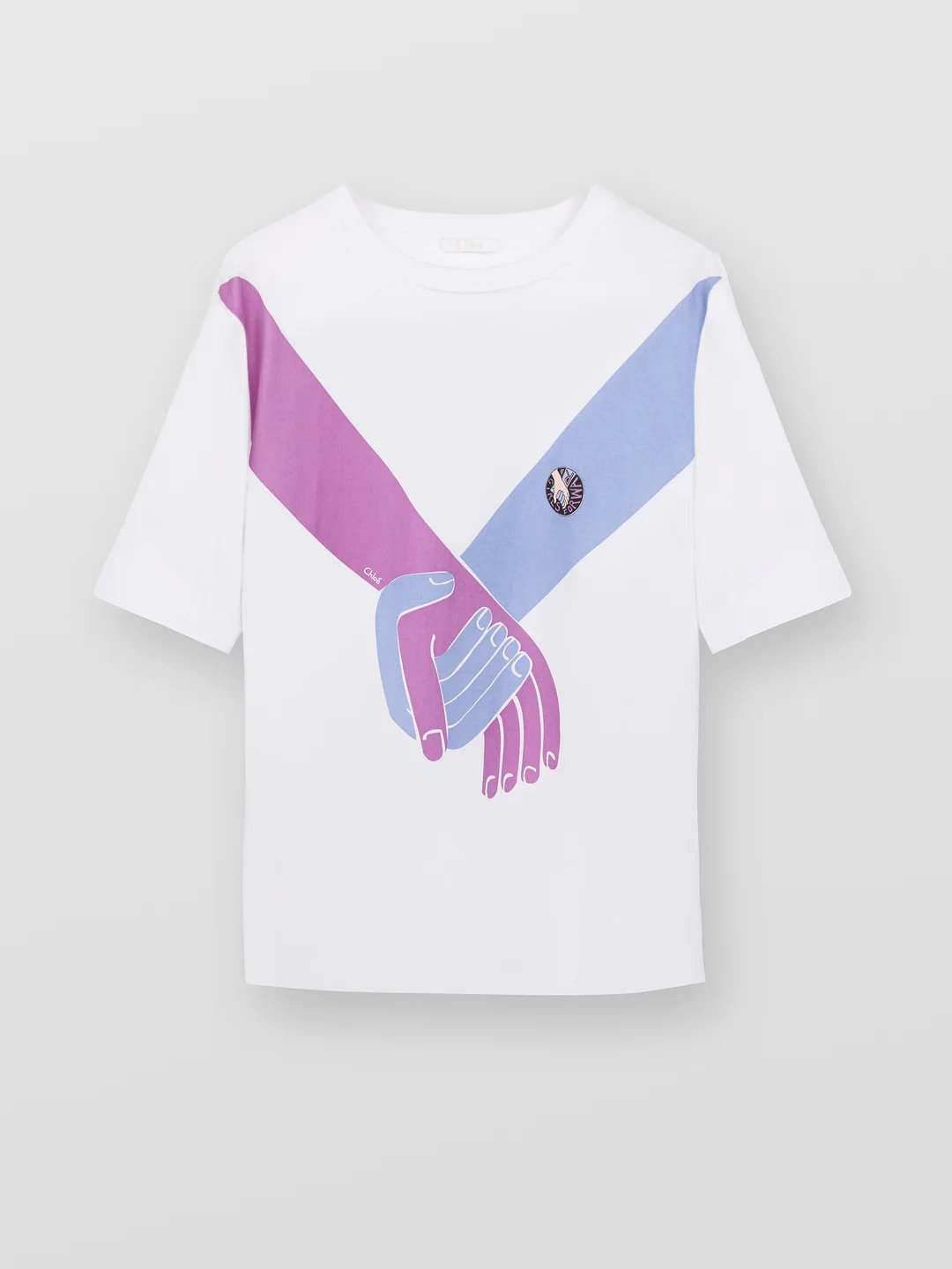 Designed by Natacha Ramsay-Levi, Chloé’s past creative director, the limited edition line features heart-shaped motifs, shades of black, white, pink, and blue, and an overarching logo of two hands joined together, which is intended to be a symbol of solidarity and sisterhood.