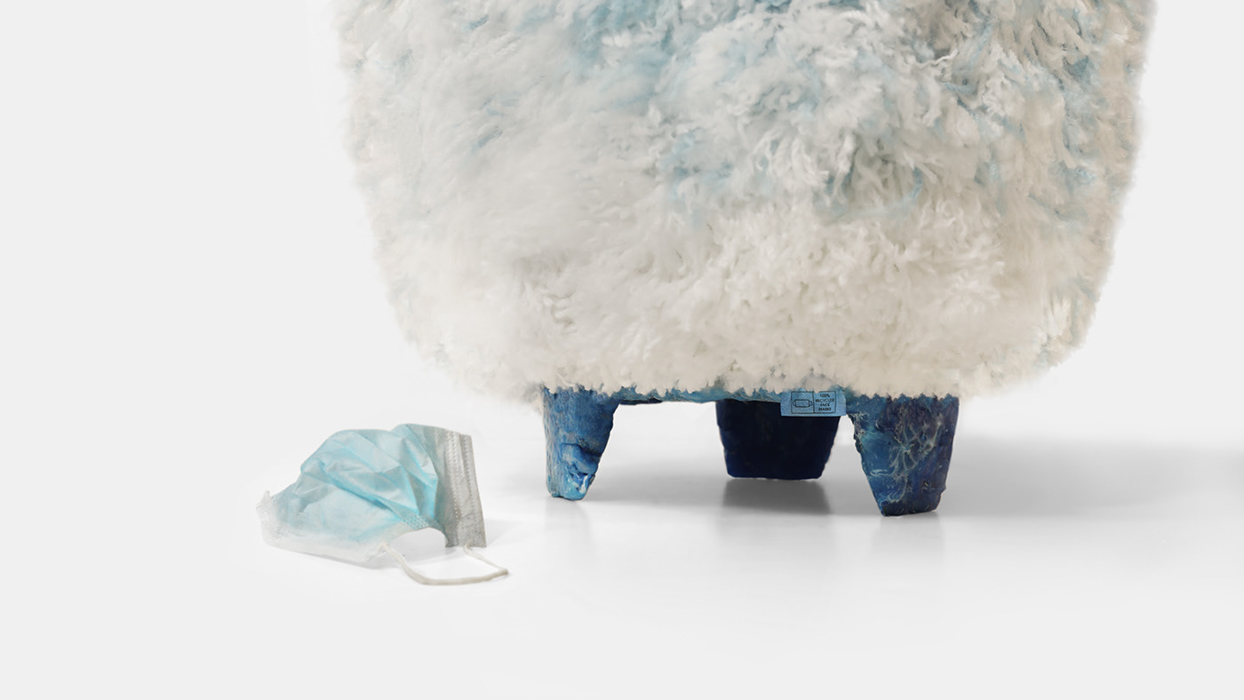 The stool’s soft, textile look was created by transforming the sanitized blue and white three-ply face makes into a wool-like yarn, while some of the pieces were melted to produce a thick polypropylene structure. Slatter used the elastic straps from the face masks to make a netting, which acted as the foundation to thread the yarn onto by using a simple cross-stitch technique called Smyrna.