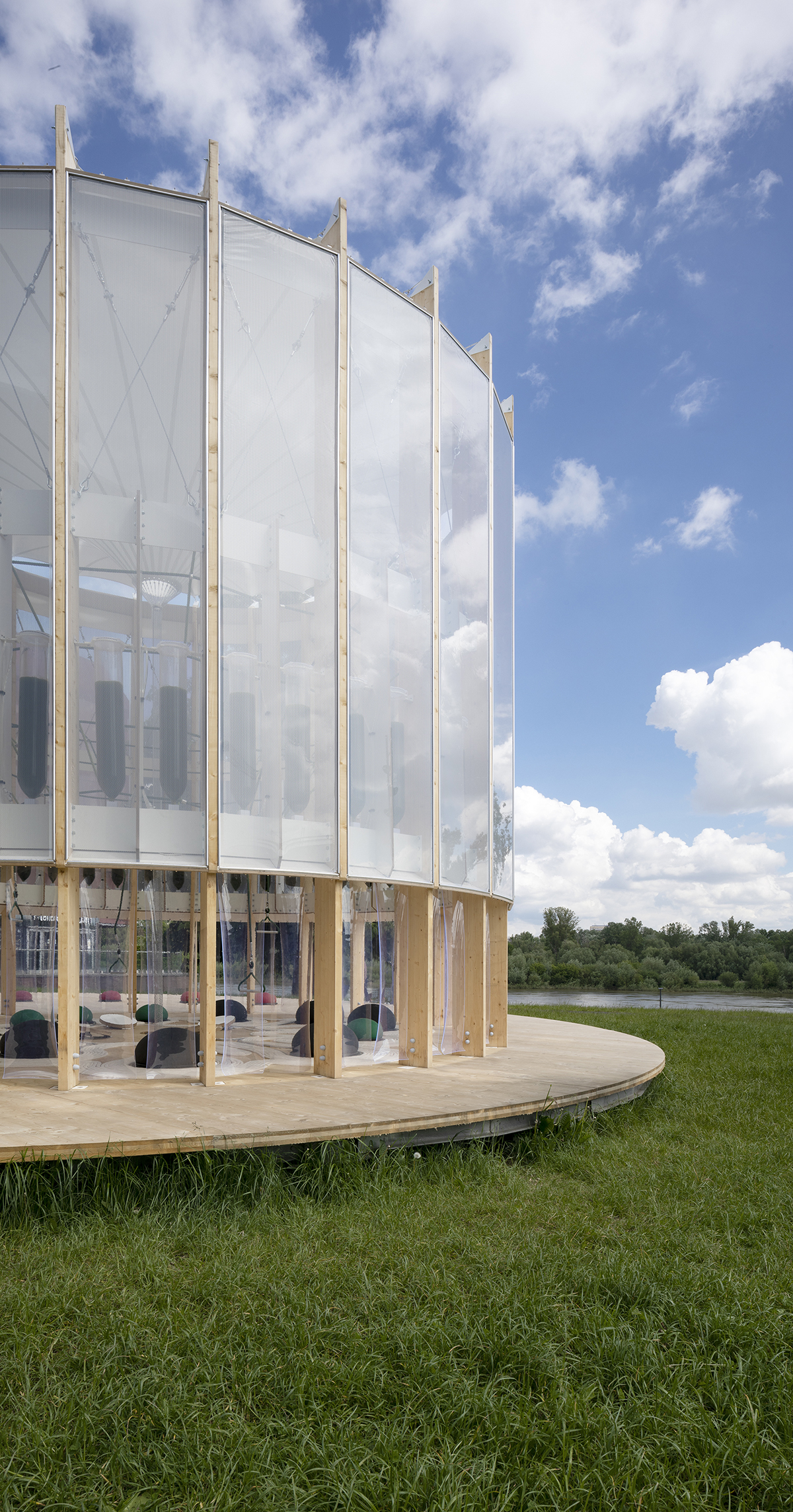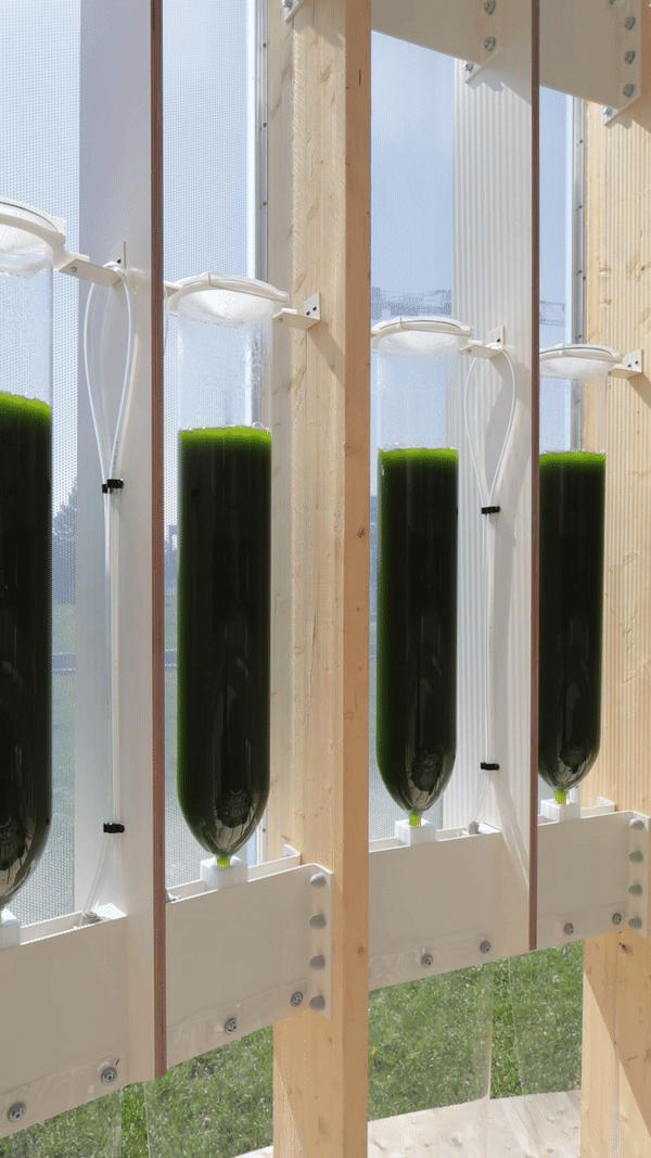 Structurally, AirBubble is made of a cylindrical timber structure wrapped in an ETFE membrane protecting 52 glass algae reactors. The 52 reactors contain 520 litres of living green Chlorella sp algae cultures that are capable of filtering polluted air at 200 litres/minute.