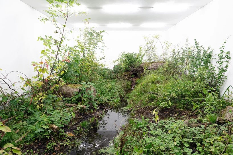 “The smell of damp earth slows your pace as you navigate the terrain of fallen logs and low growing shrubs,” added alexander levy. “Venturing beyond the first enclosure, a well-trampled corridor opens onto another white-walled room. The sound leads you along a stream fringed by greenery towards a small waterfall, whose pool offers a rippling reflection of the harsh ceiling lights. Every leaf is thrown into sharp relief against the saturated hues of the forest floor.”
