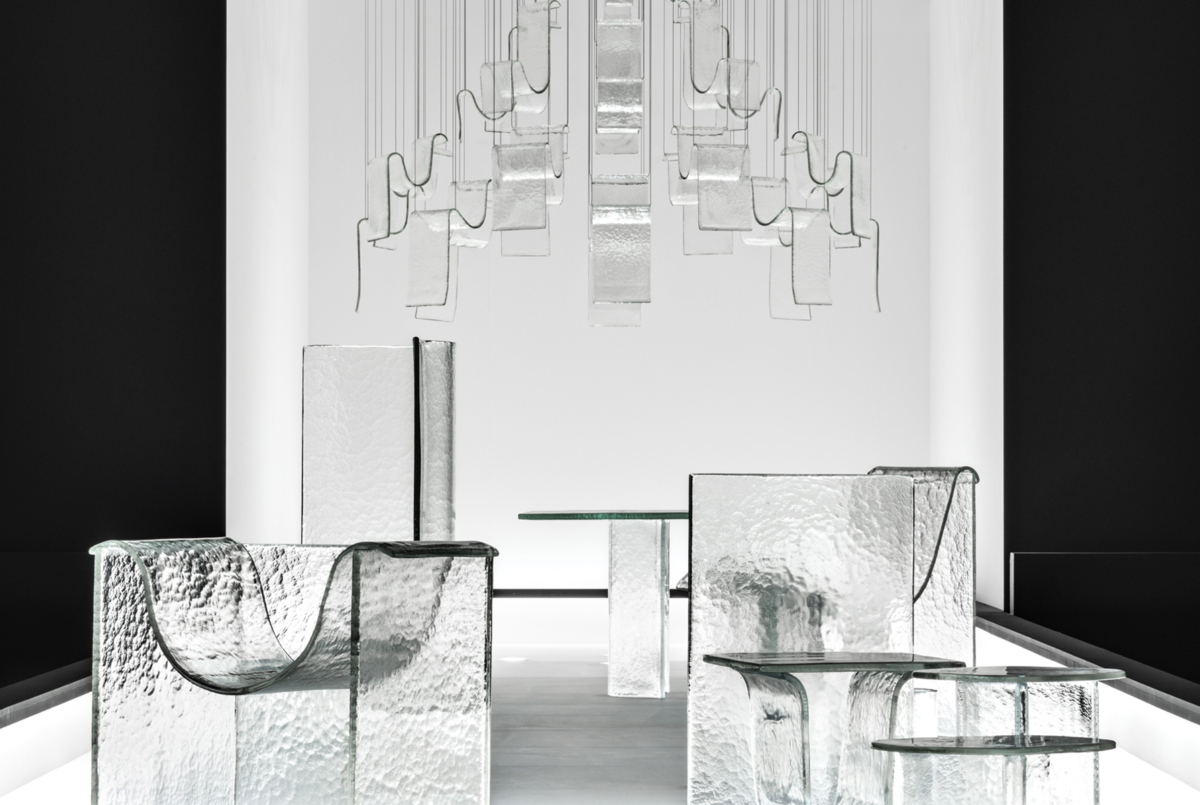 Presented at Istituto dei Ciechi as part of Milan Design Week 2019, the Melt collection features pieces such as an armchair, chaise longue, dining table, side table, vase and more. The exhibition also includes the launch of a cast glass chandelier.