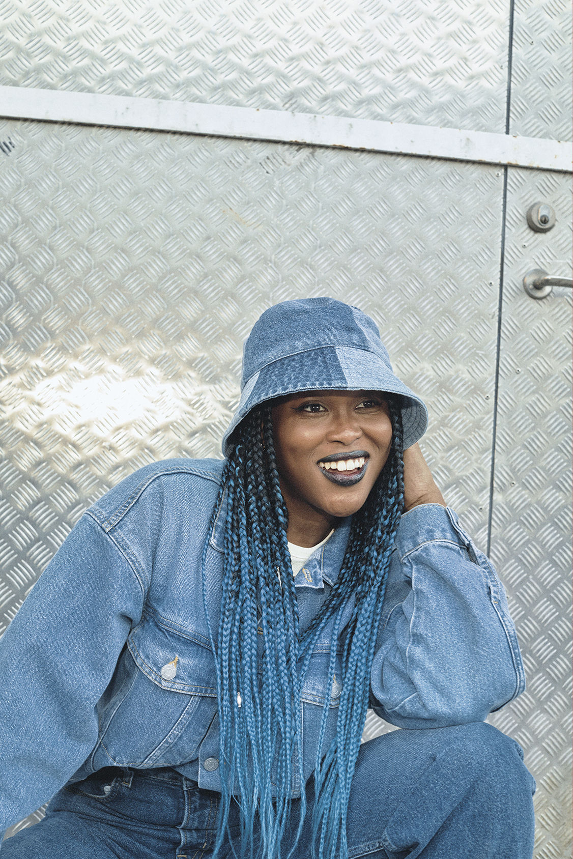 H&M’s Recycled Denim Collection currently features women’s styles only, including baggy jeans, denim jackets, shirt jackets, straight jeans, and two accessories: a denim shopper bag and bucket hat. Pieces are available in black and medium and dark blue washes. Inspired by ‘90s fashion, the silhouettes are loose and many feature a patchwork design.