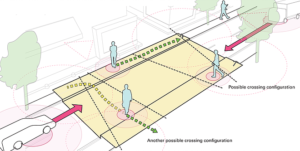 The Starling Crossing is also able to use the principles of stigmergy to monitor and adapt to pedestrian desire lines that are used over along-term. For example, if pedestrians are frequently walking across the road in one particular way, the crossing is able to reconfigure the desired path with corresponding safety buffer zones.