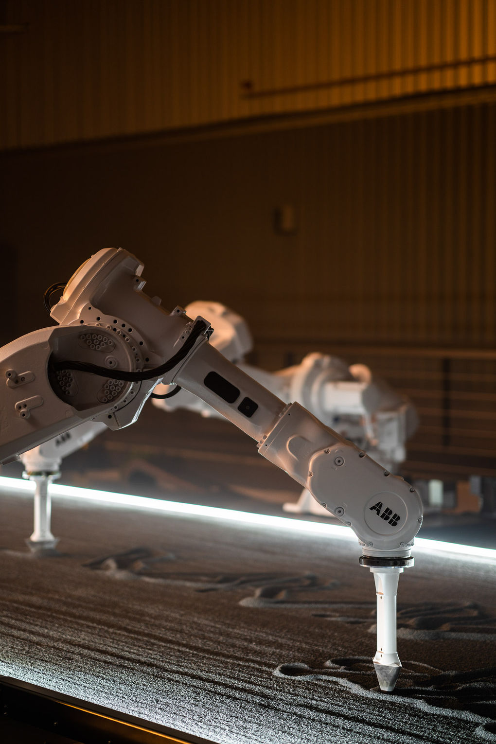 Utilizing industrial robotics and computing, the kinetic installation recreates the ancient art and culture of Japanese zen gardens with a modern twist.