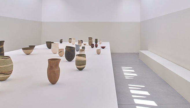 Curated by Sarah Griffin and designed by Jamie Fobert Architects, the exhibition features a monolithic plaster plinth measuring exactly the height of Lee’s studio workbench. Lee’s pots are laid out “in careful conversation with each other”.