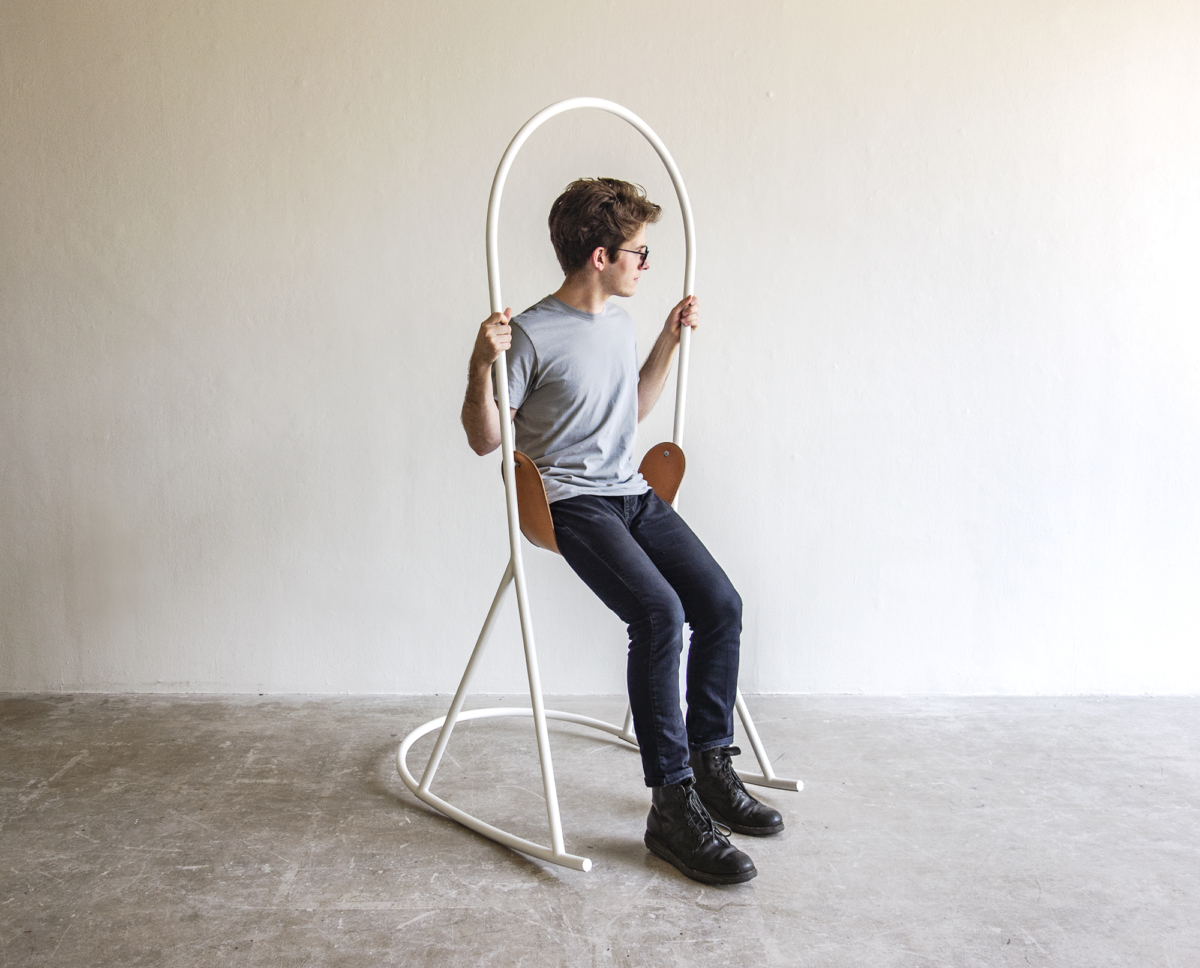 The Swing Seat is composed of a leather saddle and a steel tube that rocks. “Swing Seat challenges the instinct to seek relaxation by planting ourselves in a lounge chair when we feel fatigued,” said the desinger. “Instead, it recalls the same purpose as recess for a child – to stimulate the mind through the body.”