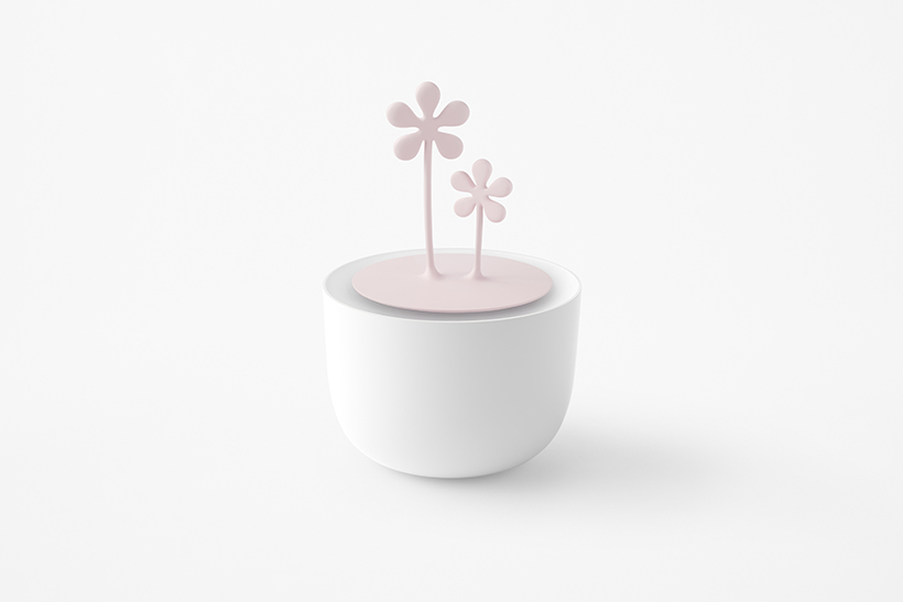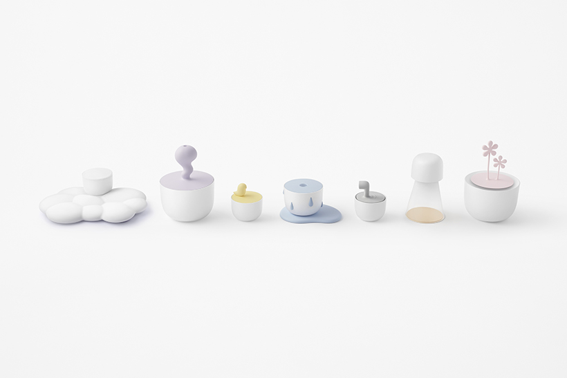“The seven products were all given a simple and analogue white bowl as the base and a silicon icon that is associated with and which symbolizes the different functions,” explained nendo.