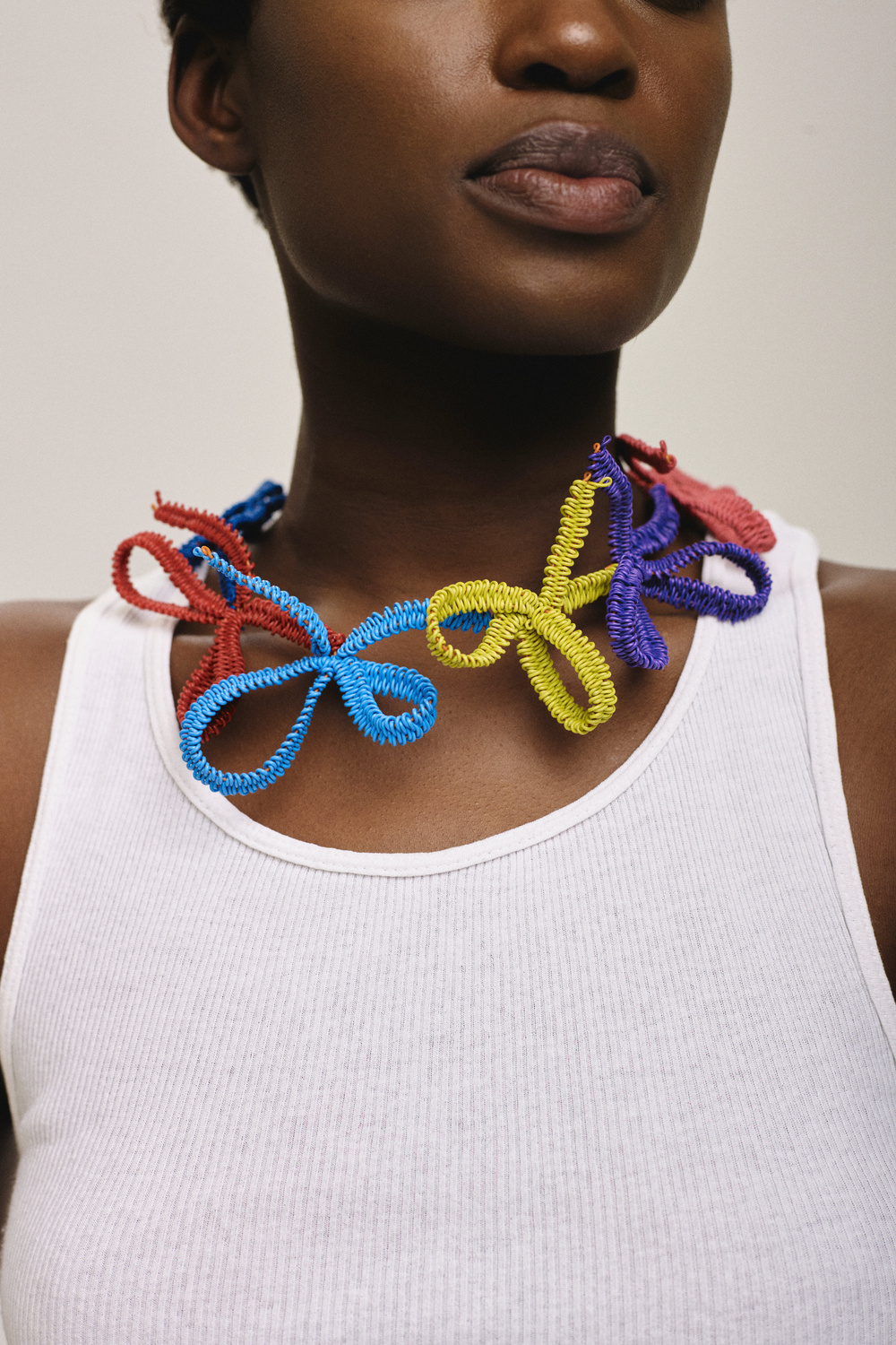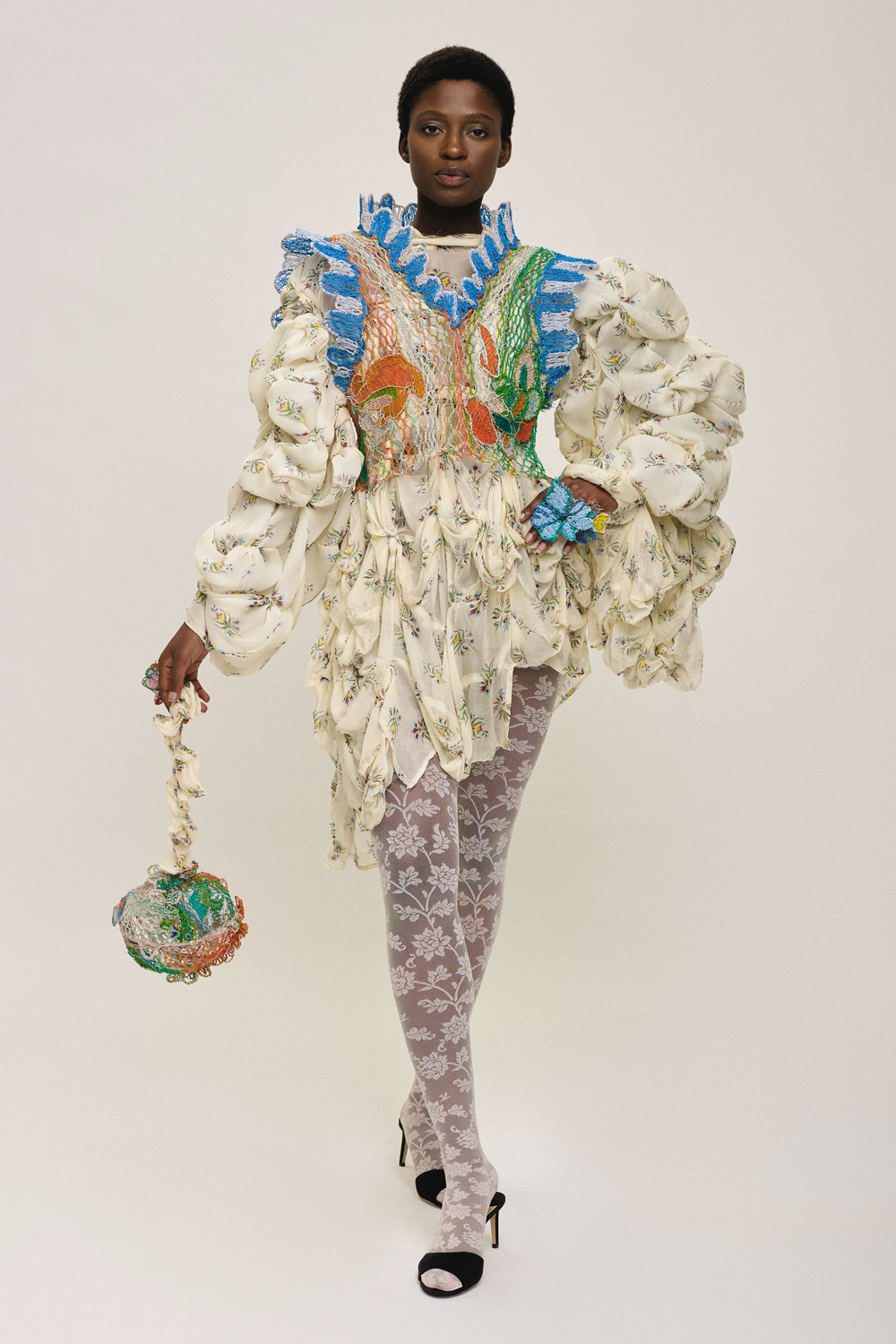 Standout items in Alexandra Sipa’s FW21 lineup include the multi-textural outerwear jackets, intricate playsuits, sculptural gowns, and delicate bralettes, which have all been created by weaving together multi-colored wire. Even the spellbinding accessories have been made to look like abstract floral patterns and oversized ruffles.