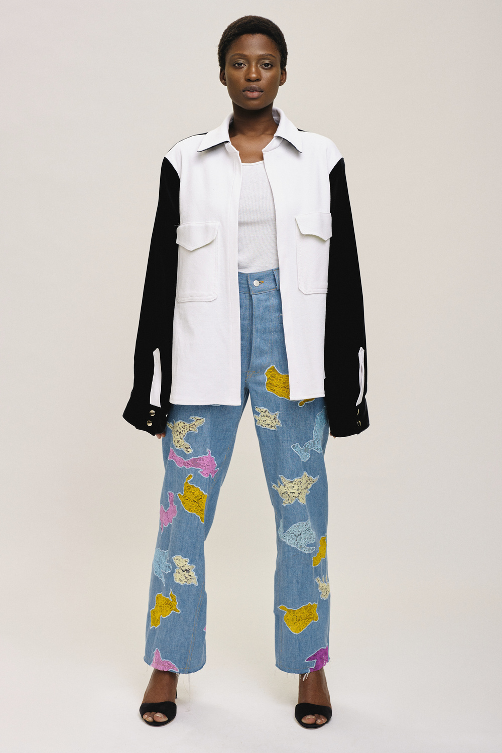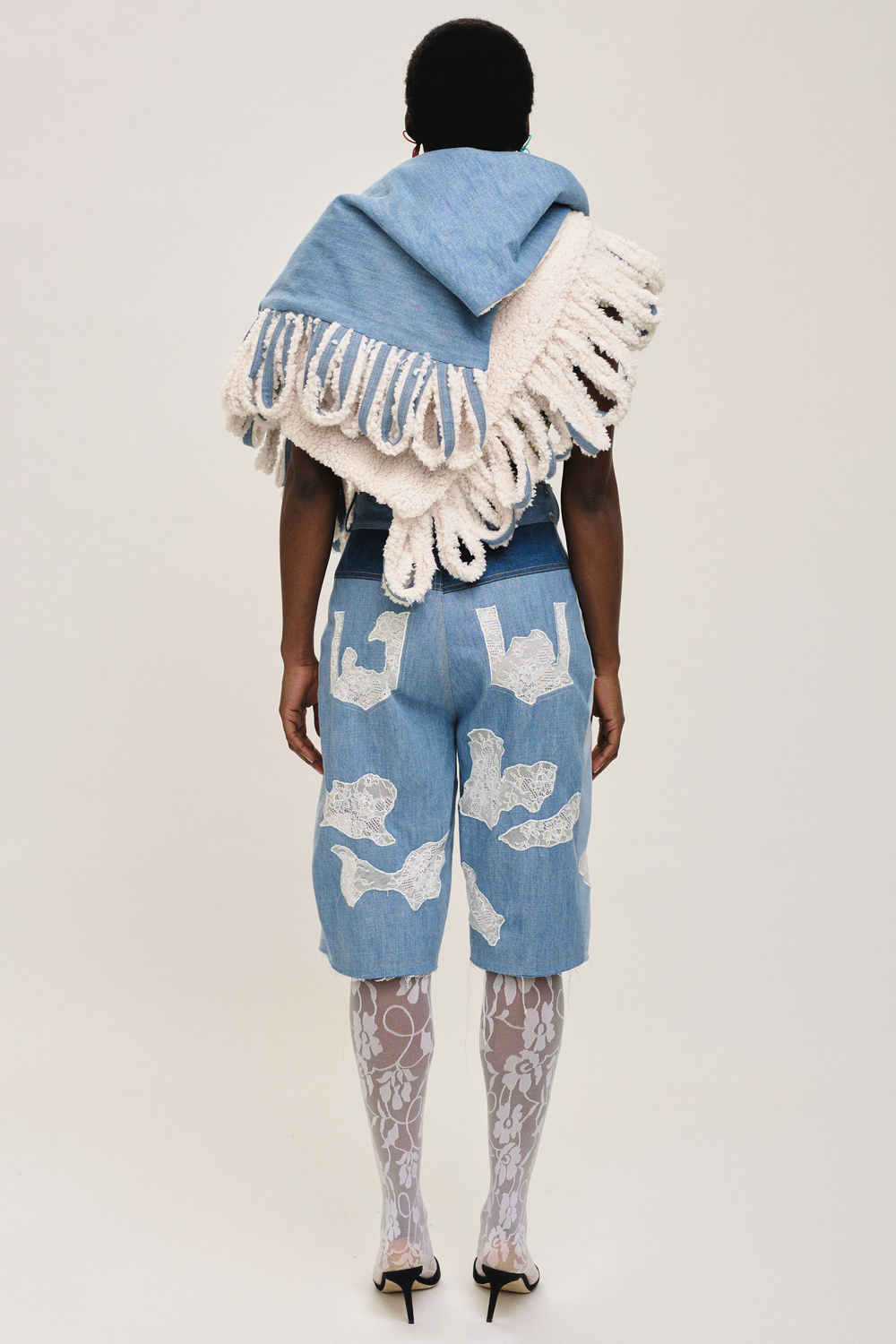 Elsewhere, high-waisted jeans and shorts made from upcycled denim are also included in the seasonal offering and have also been embellished with lace appliqués throughout. Finally, lycra bike shorts, long-sleeved shirts, and bodysuits round out the bold and avant-garde collection.
