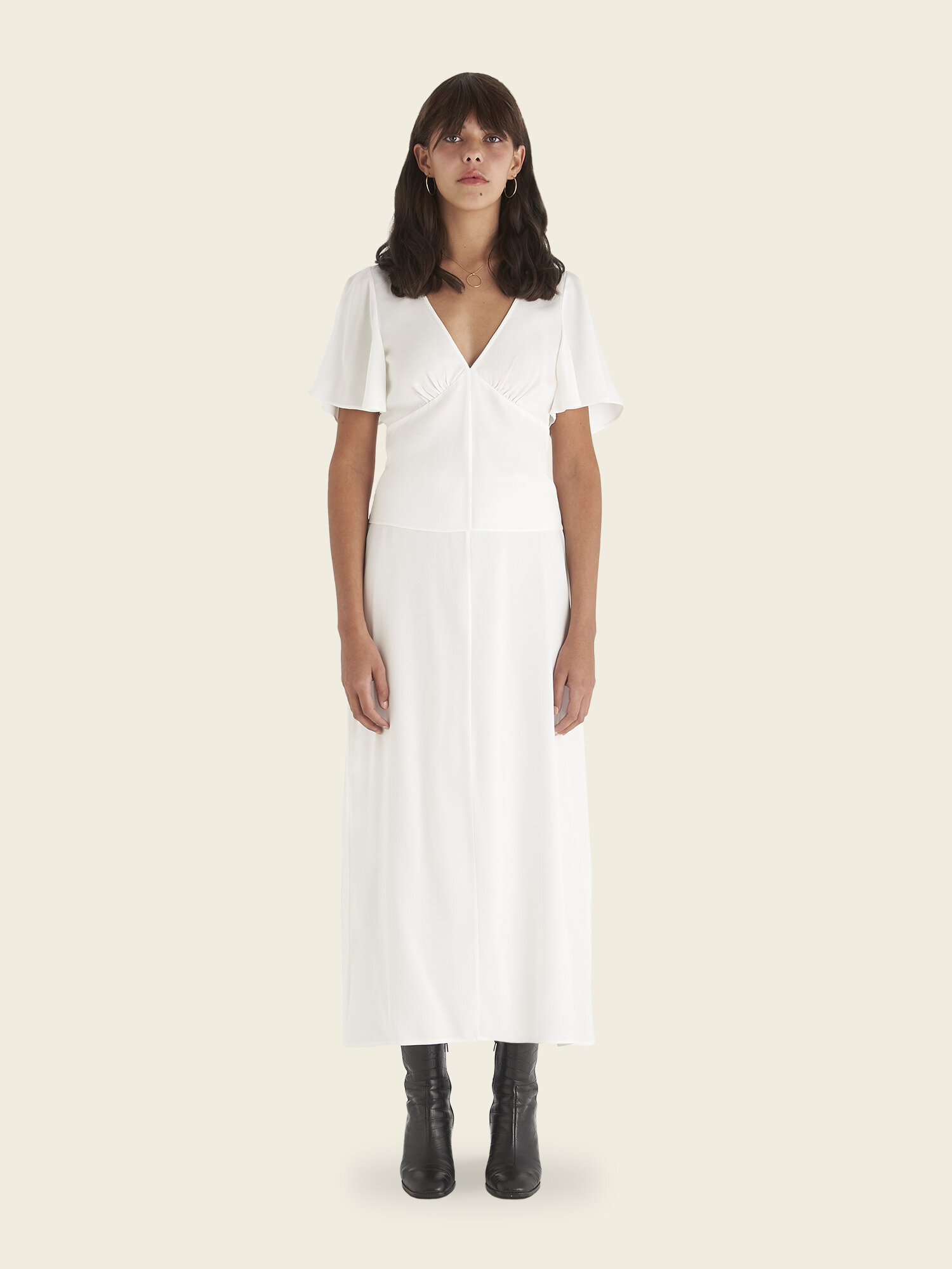 The brand’s debut collection consists of a muted colour palette of white, tan, and brown and features classic everyday pieces, ranging from a flounce sleeve maxi dress to ‘70s inspired wide-legged trousers.