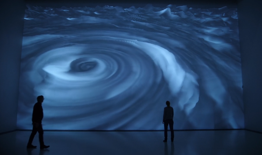 Visuals in shades of black and blue with a variety of texture effects such as smooth and streaked are projected onto a wall for the Pixels Liquides installation. Visitors are able to interact and alter the visuals in real-time with the movement of their body.