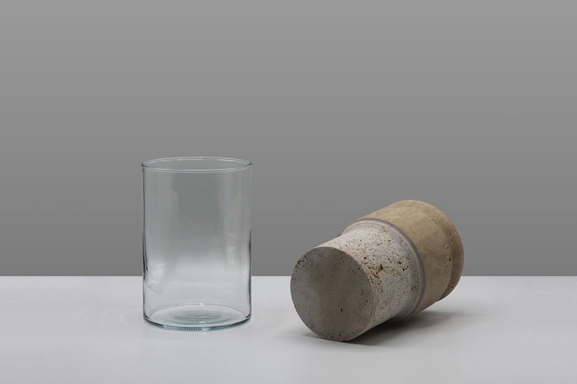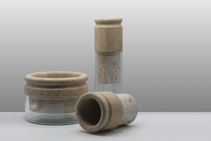 The sponge collection is composed of three planters of varying diameters ranging from 10 to 22 cm (3.9 to 8.6 in). Each planter incudes a travertine marble top with a glass base.