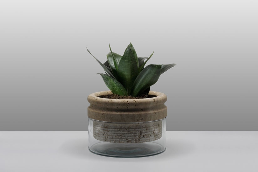 In doing so, the travertine marble soaks the water in the glass base and the mineral salts present in the holes of the marble are transported with the water to the plant.