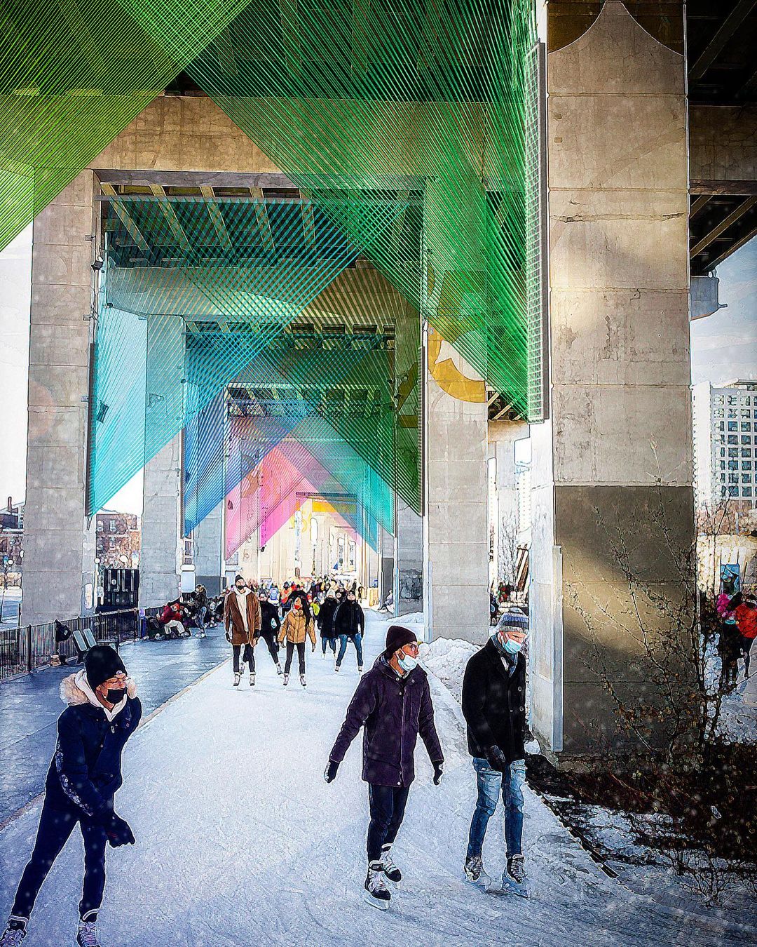 What makes The Gateway truly captivating is its dynamic interaction with passersby. As visitors move beneath the Expressway’s columns, the installation comes alive, weaving a mesmerizing play of colours overhead. This interactive display mirrors the vibrant energy of The Bentway, inviting everyone to become part of the art.