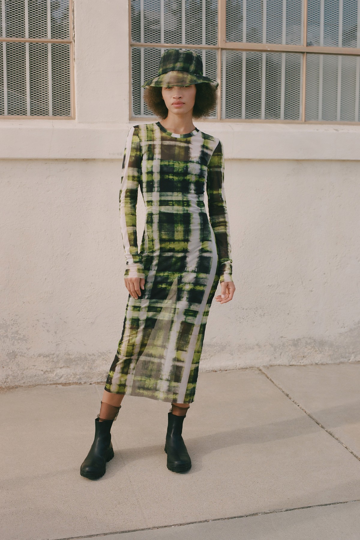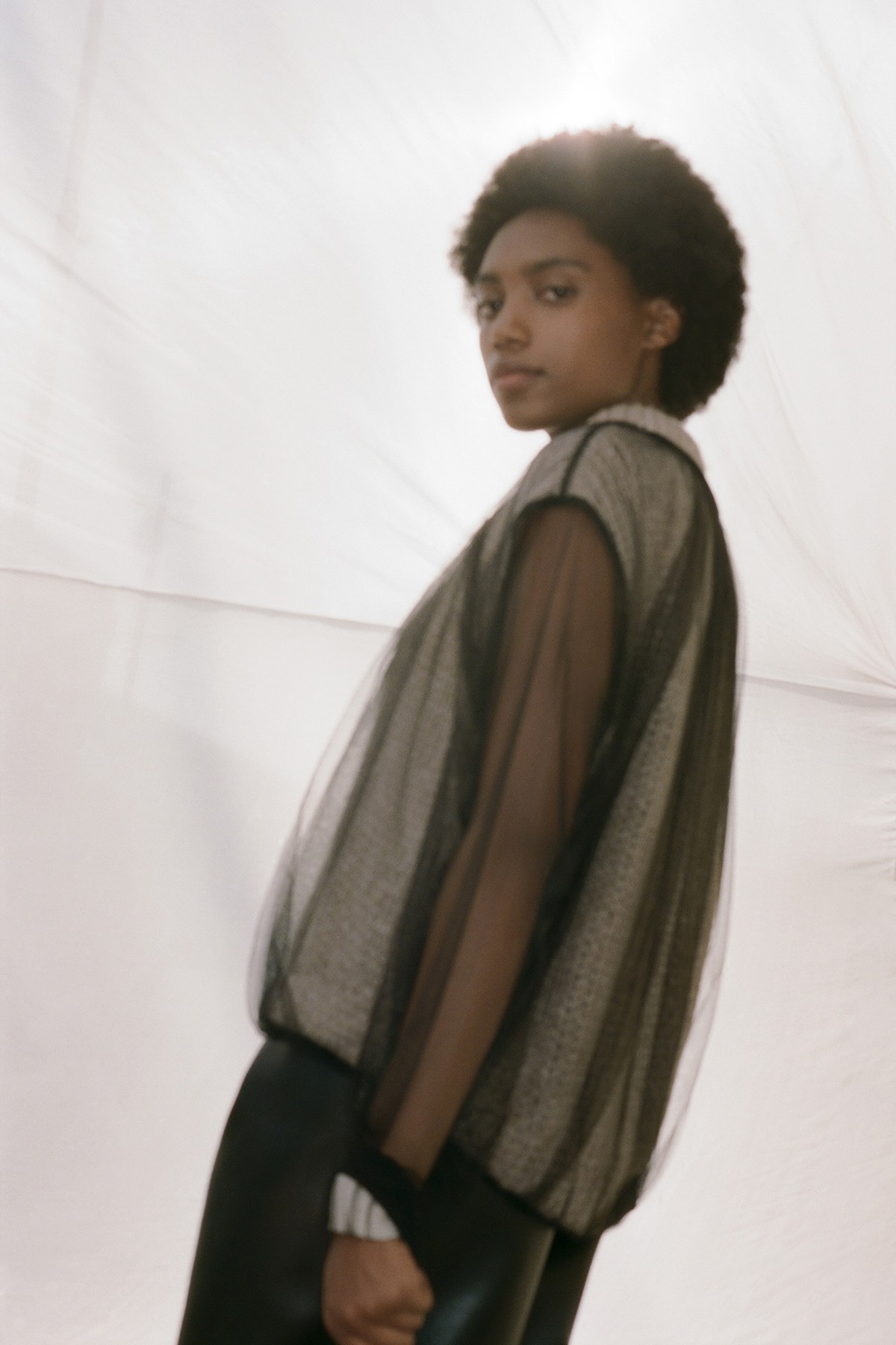 In terms of colour palette, the collection consists of similar hues of black, white, and tans, with a graphic yellow and green-checkered print sprinkled in. The brand also doesn’t shy away from using louder materials such as PVC and tulle to pair with its minimalist designs.