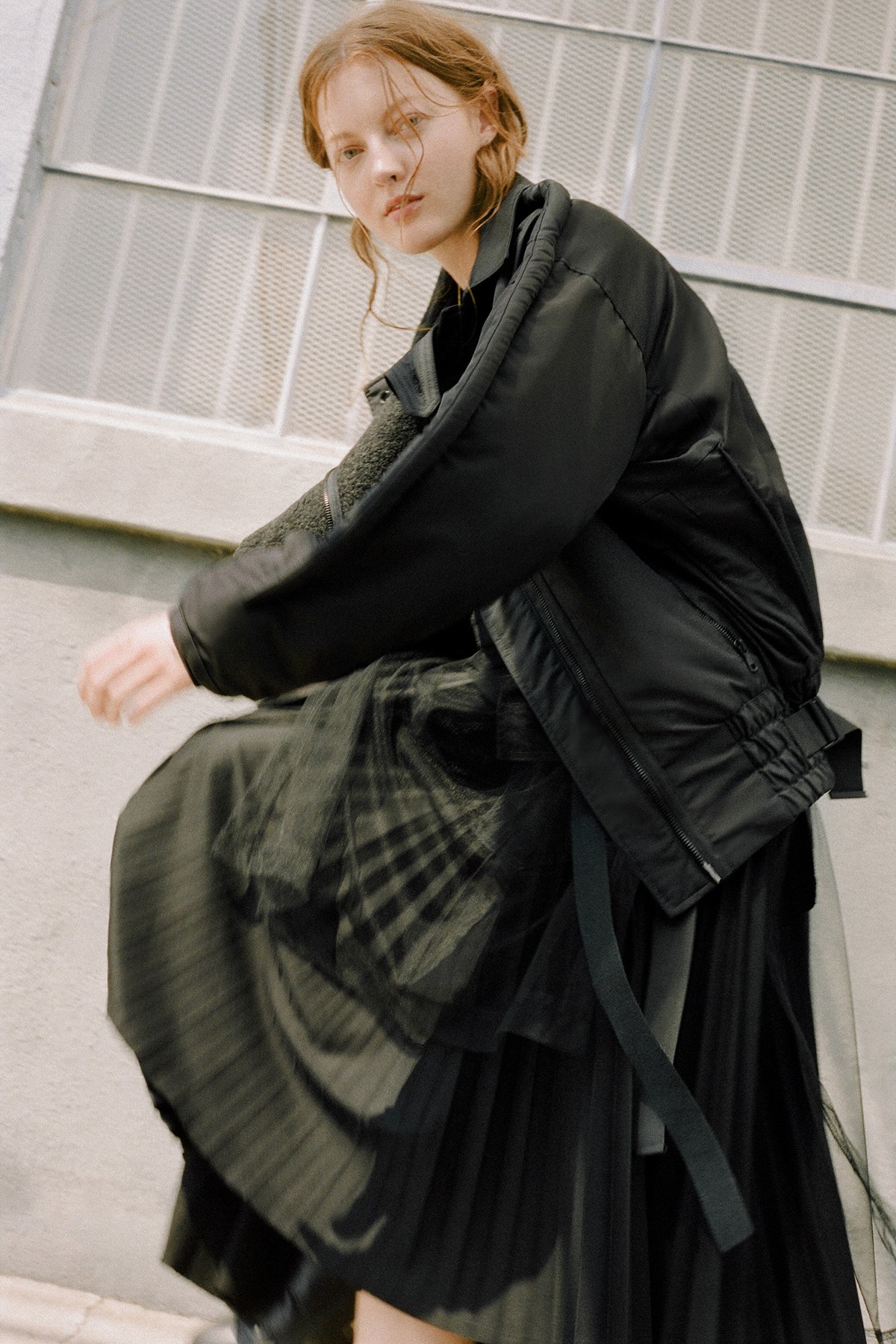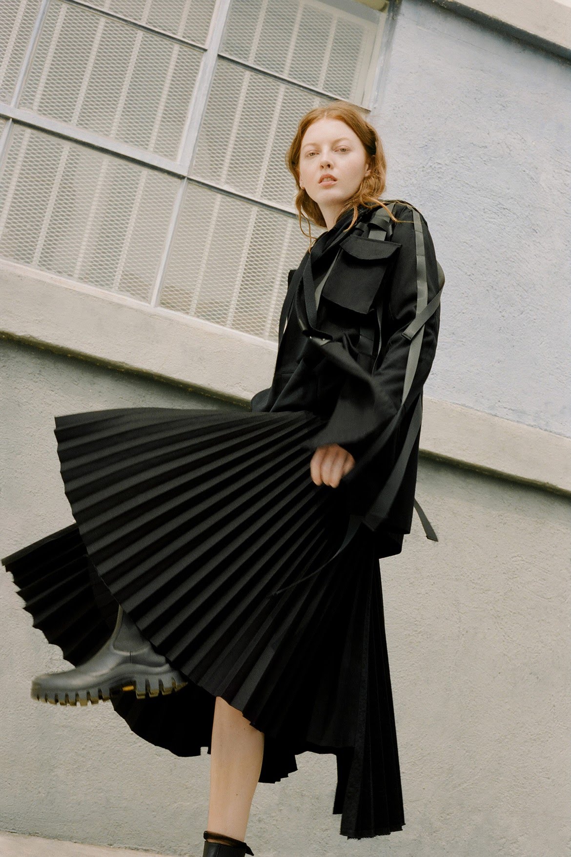 Parkas embellished with loose industrial strap details and large removable patch pockets are paired with elegantly pleated midi skirts and tailored trousers. Elsewhere, a bomber jacket is contrasted with a tulle and silk skirt, while a trench coat matches perfectly with a formfitting slip dress. Other notable items include the boxy midi dress accented with strategically placed cut-outs and straps, along with the chunky deconstructed mohair sweater overlaid with delicate tulle.