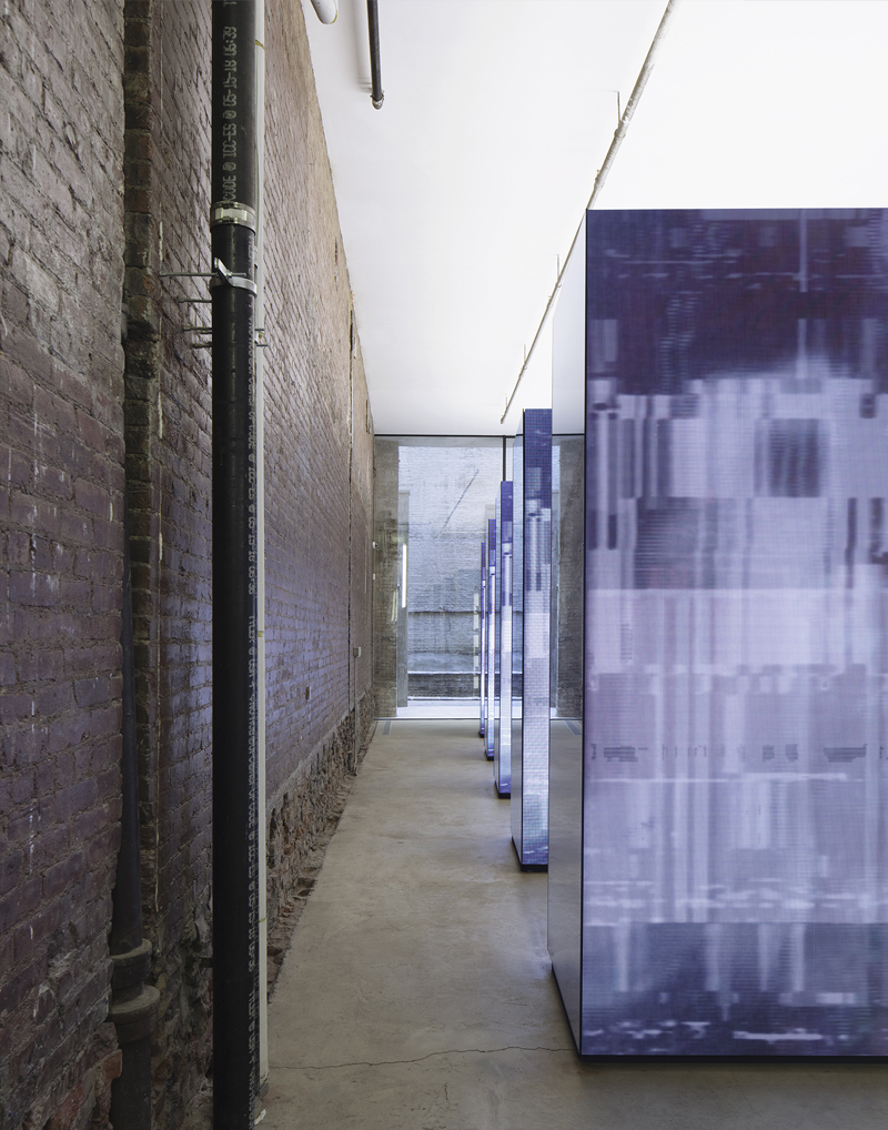 Illuminated with fluorescent tube lights, the exposed brick walls and concrete flooring of the 1800 sq ft (167 sq m) space is contrasted with five modular rack installations that are described by Leong Leong as being a monolith. Clad with LED screens, the slightly angled racks display videos that are played on a loop.