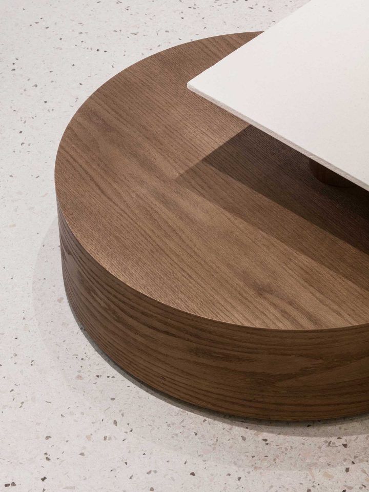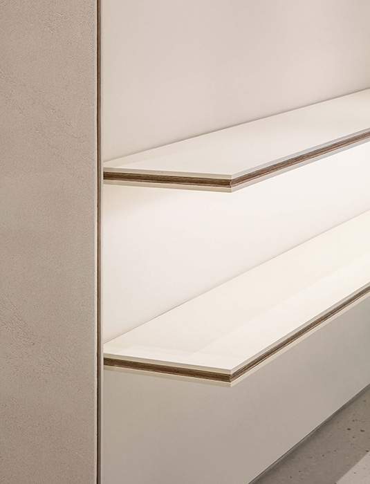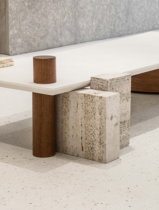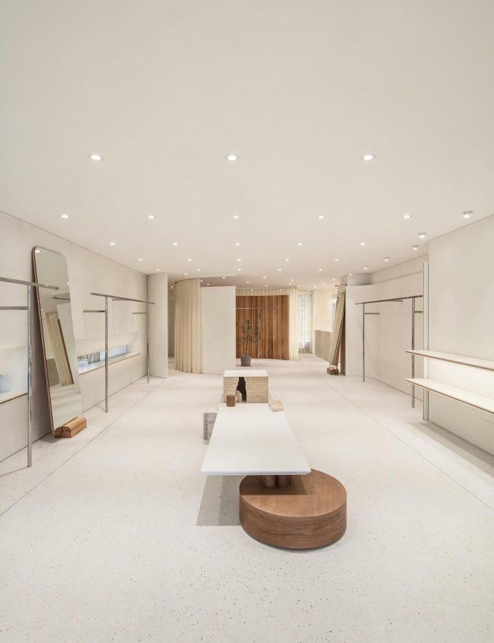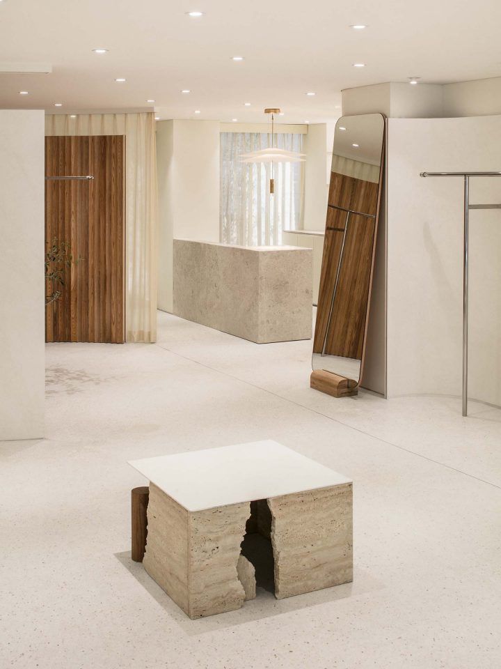 With the space composed of materials such as stone, wood and stainless steel, unique pieces of furniture are placed throughout to complement both the materials used and the products on display.
