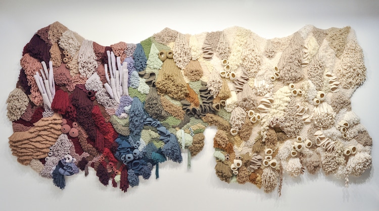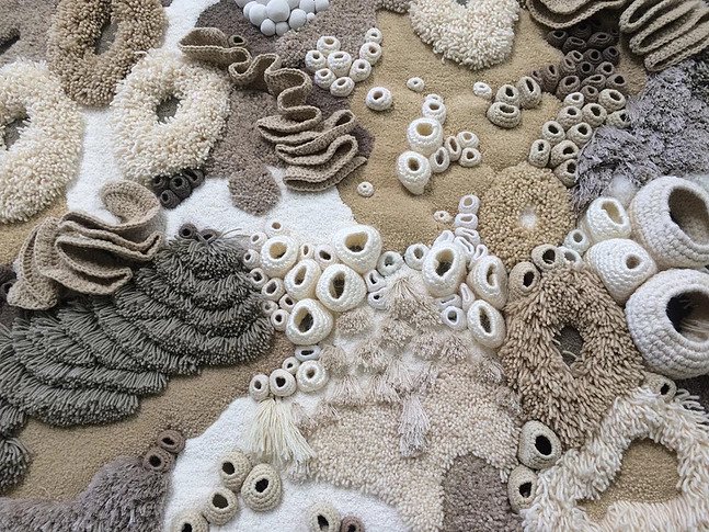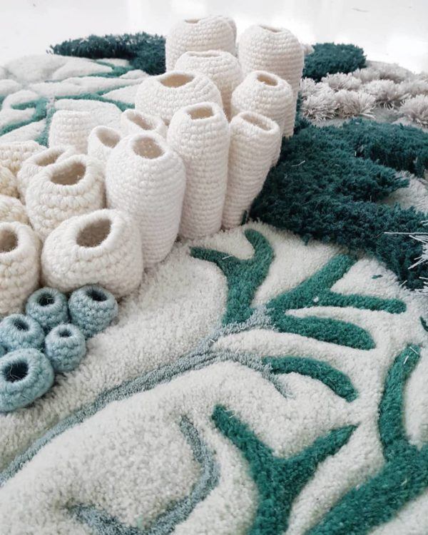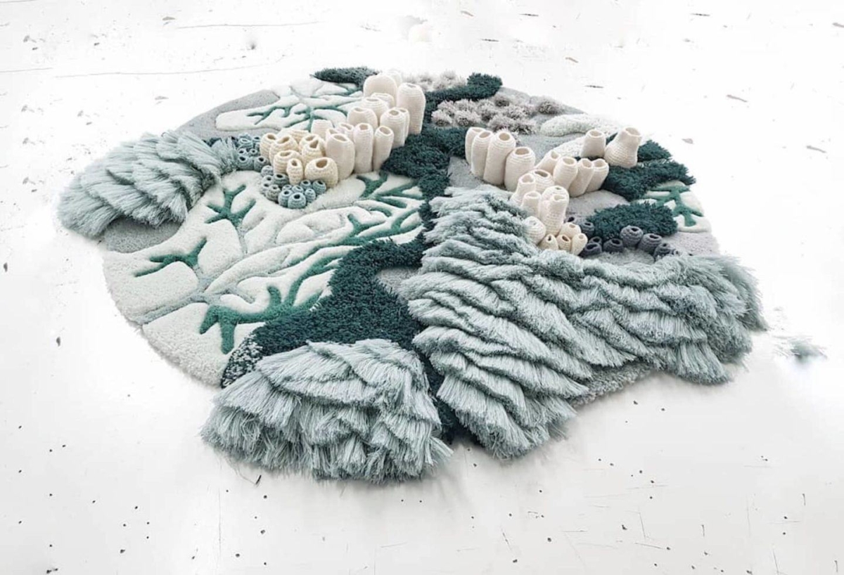 Utilizing techniques such as hand tufting, crocheting, embroidery, knitting and weaving to create rugs, carpets and wall hangings, the tapestries depict the intricate and fragile life of underwater ecosystems.