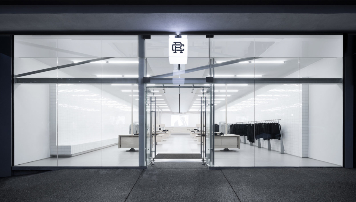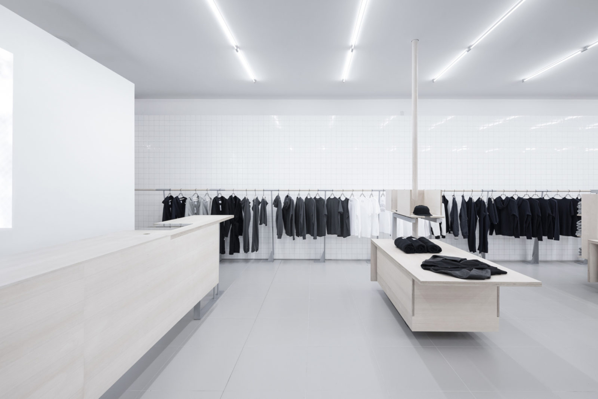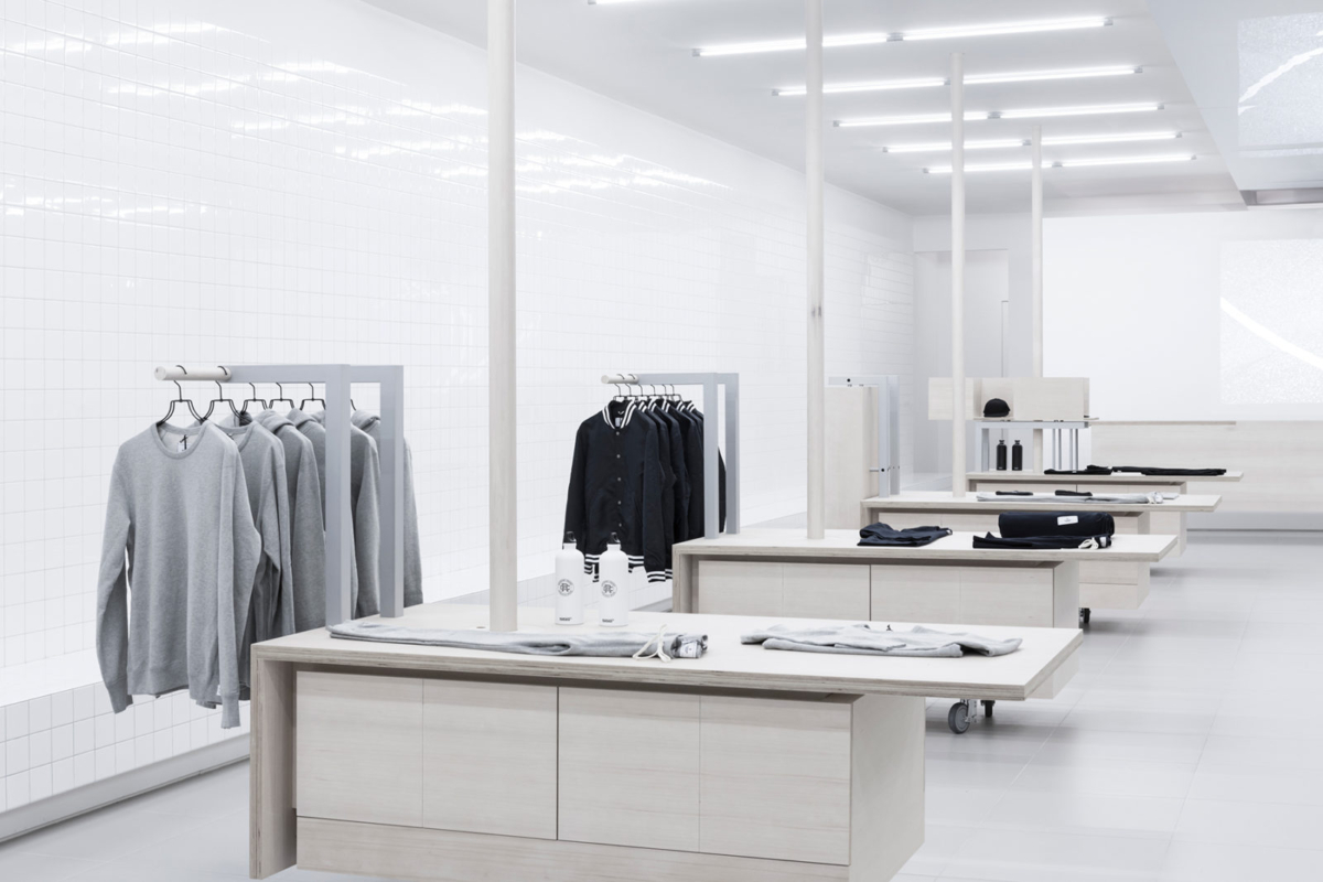 With white tiled walls and light gray linoleum flooring, Reigning Champ’s pieces are contracted and highlighted.
