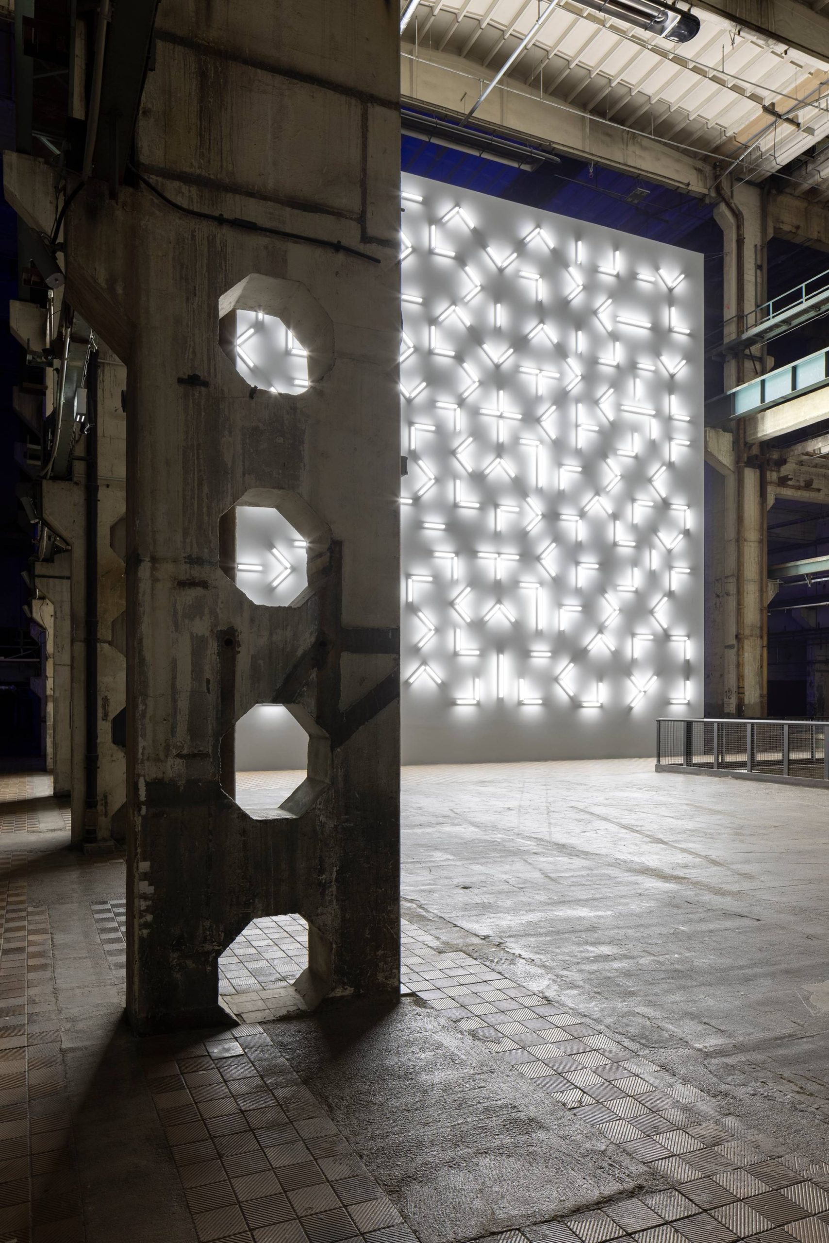 Light and Space is made up of numerous fluorescent light tubes that are laid out in an abstract pattern on a massive white wall. Contrasting the blinding white light is a dark blue and purple mix on the other side of the wall. According to LAS, the installation is the largest work of its kind in Europe.