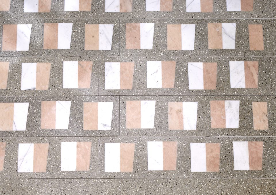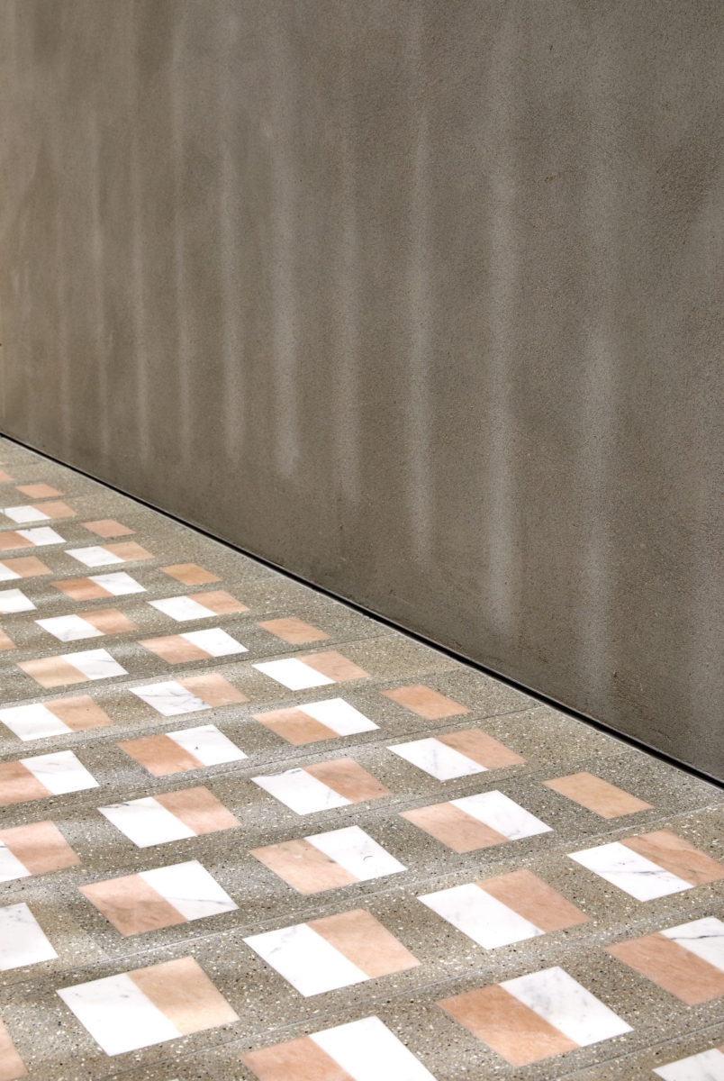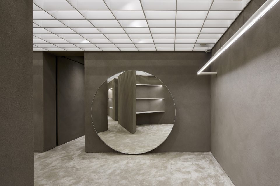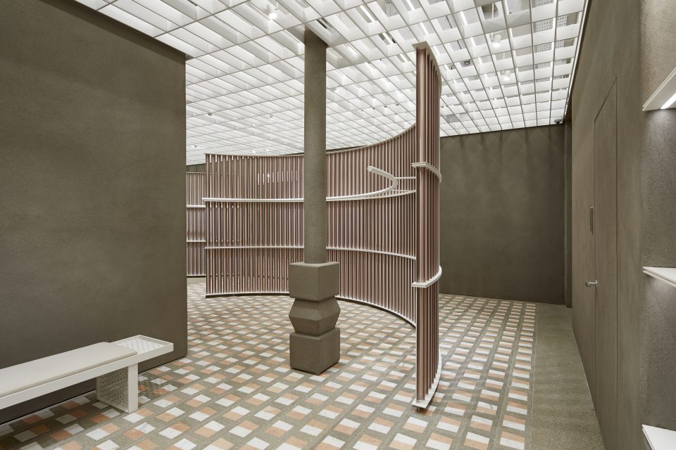 On the second floor, there are two curved metal screens and a custom terrazzo flooring with pink and white marble insets. There are also two stairs to provide customers with a more “playful loop” when exploring the store and its merchandise.
