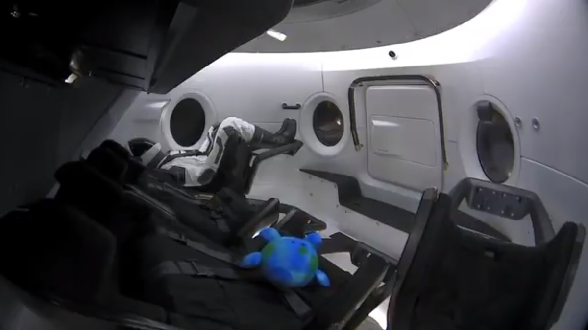 On board Crew Dragon’s unmanned demonstration flight is 400 pounds of supplies and equipment, an anthropomorphic test device fitted with various sensors called Ripley, and a plush toy of planet Earth.