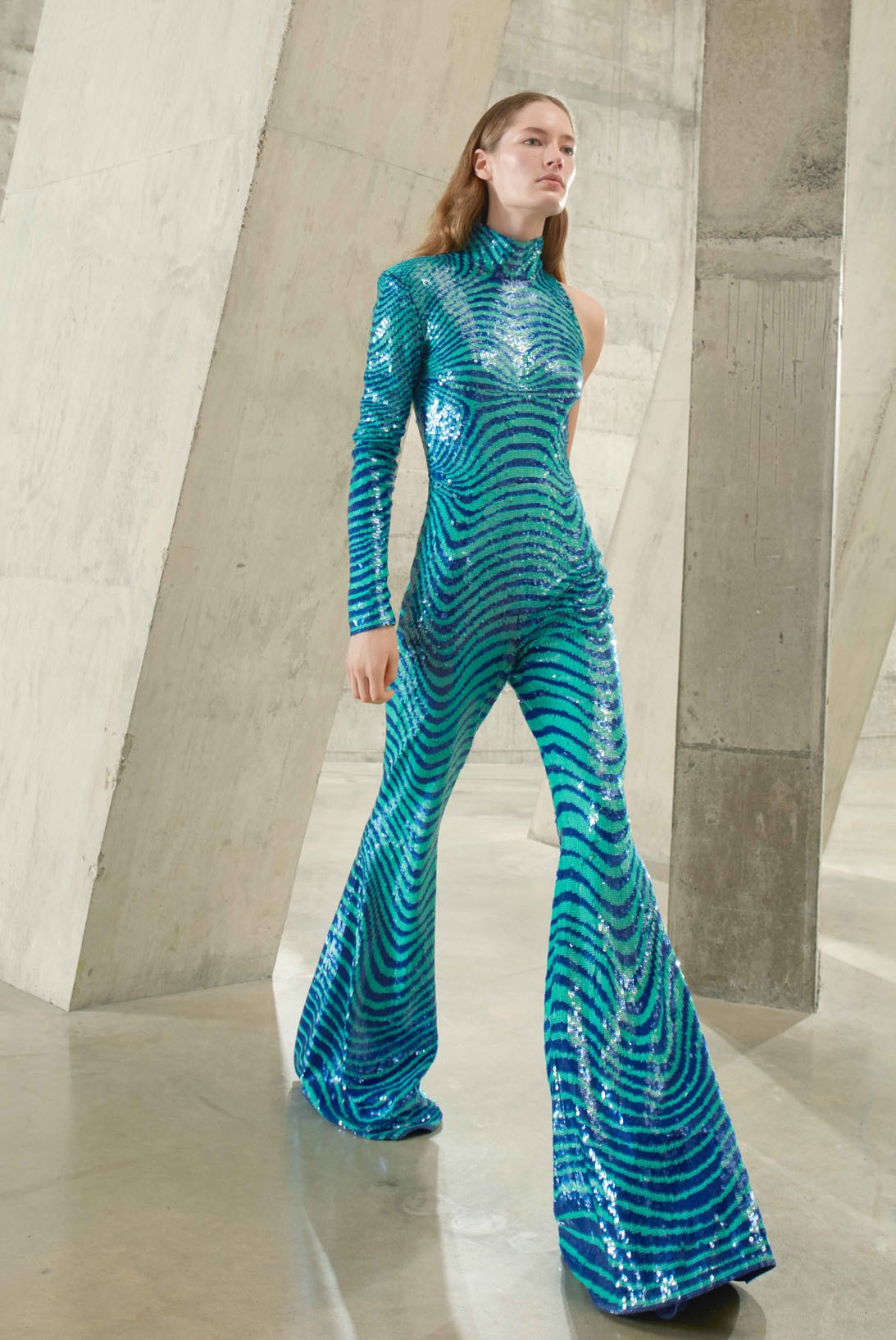 Injected with British heritage and inspired by London club aesthetics, the looks featured brightly coloured ruched body con dresses, power suits, psychedelic jumpsuits, shouldered houndstooth coats, exuberant kick flares, and shimmering thigh-high boots.