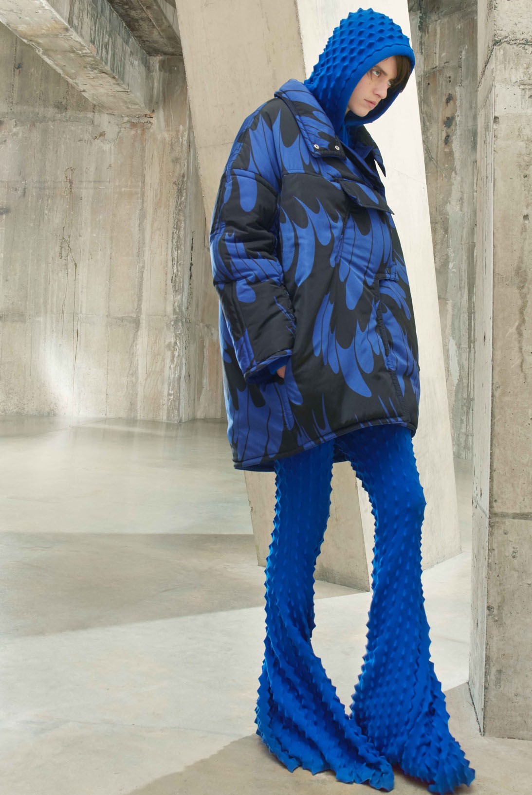 Mixed in between were cozy knit sweaters, peplum skirts, and sporty bomber jackets. Through all the vibrant outfits, McCartney managed to perfectly balance all the looks through volume, texture, contrasting prints, and a colour palette of purple, electric blue, magenta, yellow and green.