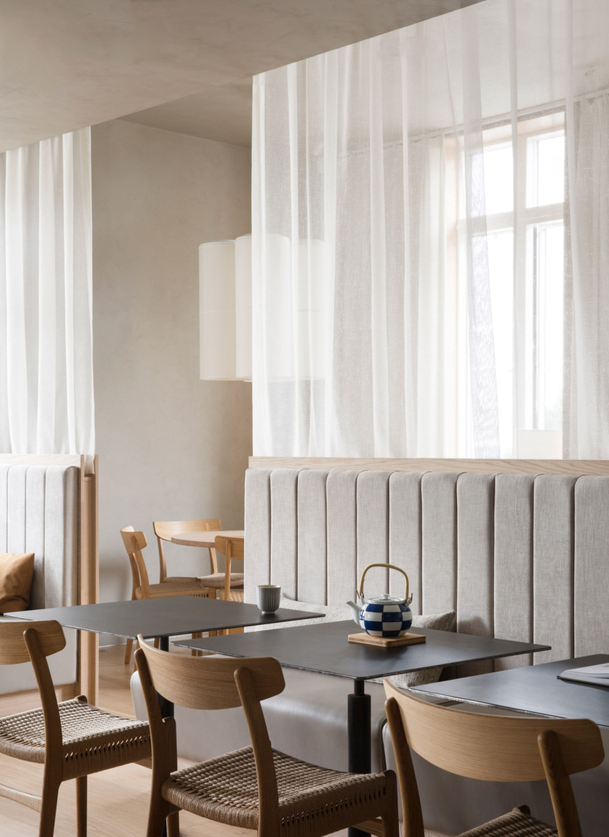 “The textiles throughout the restaurant were carefully selected to suit the various settings: heavy where needed to create a warm and private seating area and light where installed as subtle, elegant room dividers that play with the light,” explained Norm Architects.
