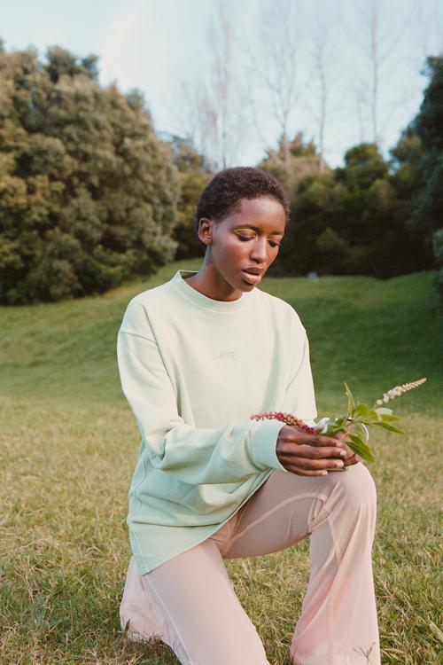 To aid in SAYE’s goal of becoming completely animal-free and zero-waste, all items in the unisex lineup are fully vegan. Additionally, each piece is crafted from organic cotton and ecological yarn made from waste such as plastic bottles and used clothing.