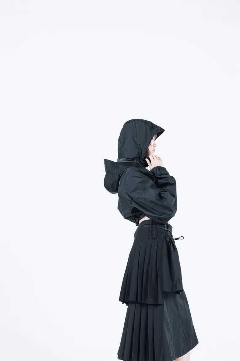 Beyond outerwear, the collection extends its innovation to a two-piece set comprising a double hooded jacket and a double-pleated wrap skirt, both meticulously crafted from repurposed materials. The Volume Hybrid Pant, constructed with various materials and adjustable buckles, epitomizes versatility in fashion, offering multiple wearing options.