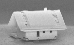 Starting off with a sheet of silica as the building material being placed on top of a cleaved optical fiber SMF28, a dual beam scanning electron microscope (SEM)/focused ion beam (FIB) Auriga 60 from Zeiss was used to cut out the shape of the house on silica, which was then folded into place by a six degree of freedom robot built with SmarAct components.