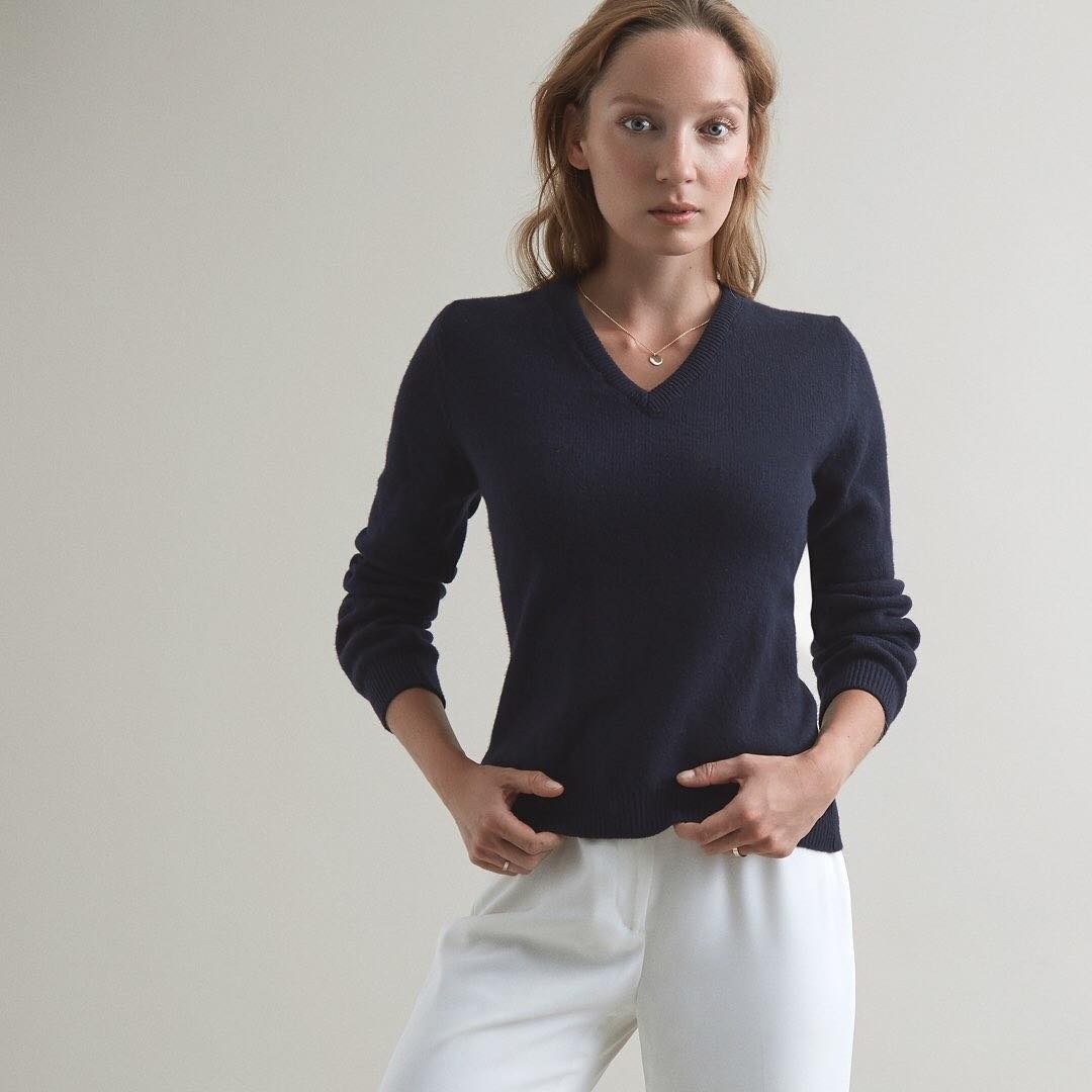 Utilizing a traditional spinning mill to spin the yarn, the V-neck pullovers are knitted and handsewn in an Audrey Hepburn style.